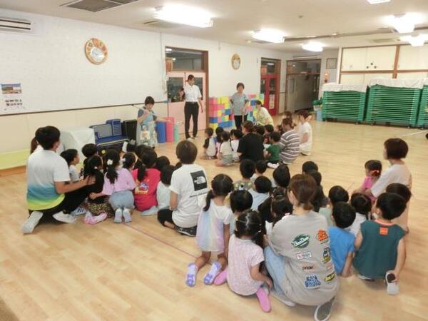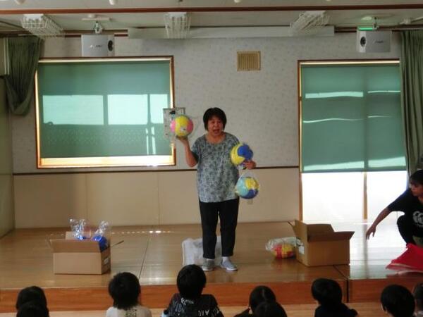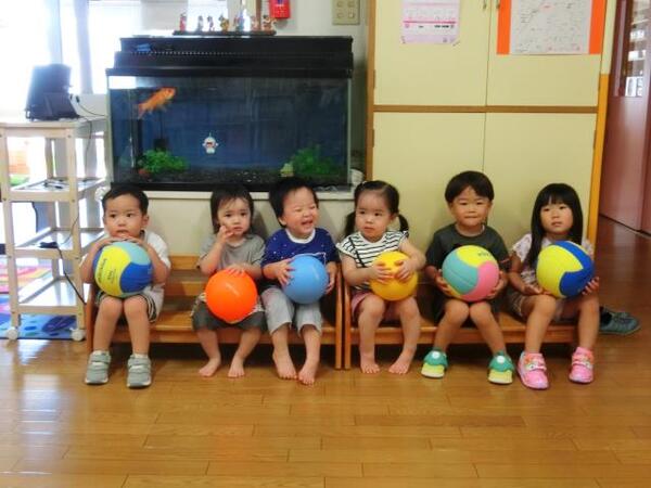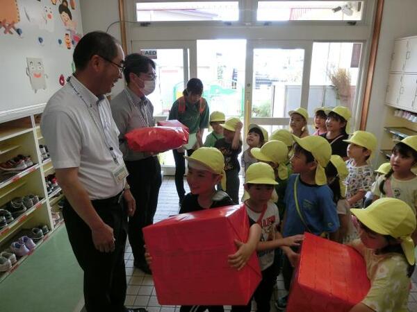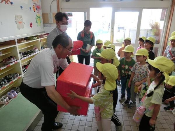 | 8月1日(金) 昨日トヨタカローラさんより『マッチングギフト』の寄贈がありました。 代表してすみれぐみのお友だちが受け取り、お礼を伝えています。 そして本日、ギフトの中身を皆の前で開けてみましたよ。 ボールがたくさん入っていて、大喜びの子ども達でした。 大切に使わせて頂きます! ありがとうございました。 |