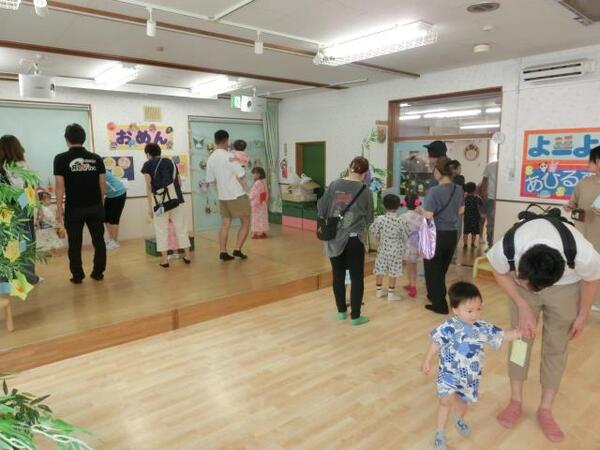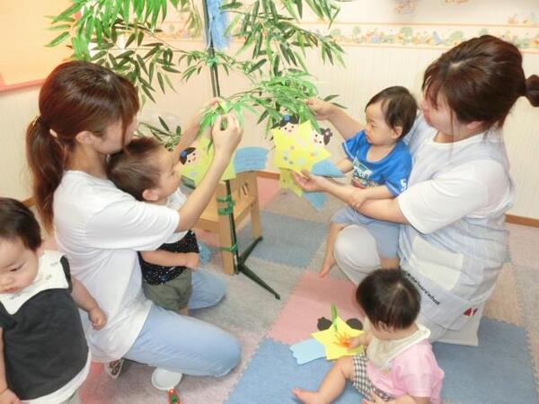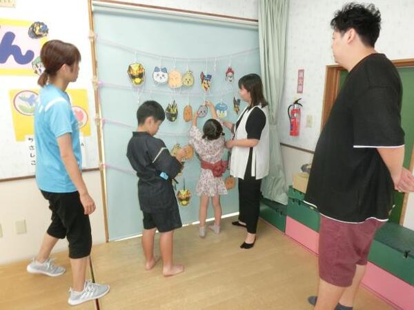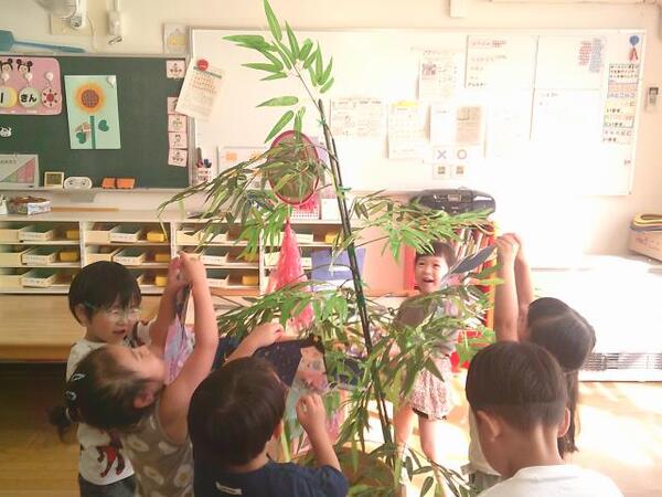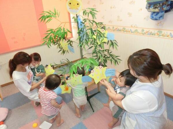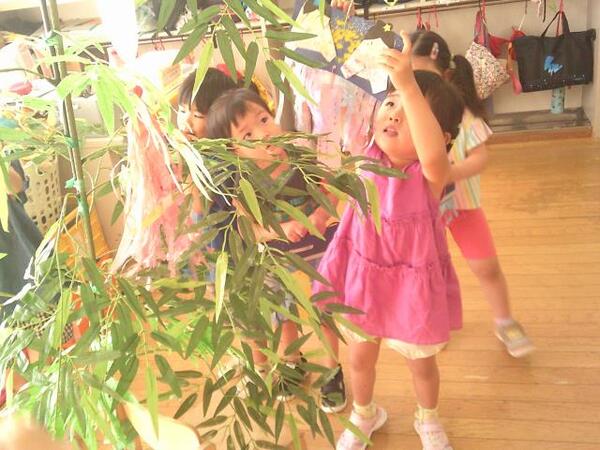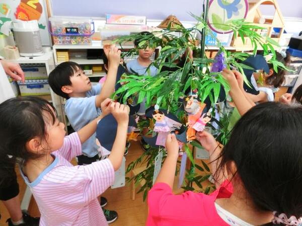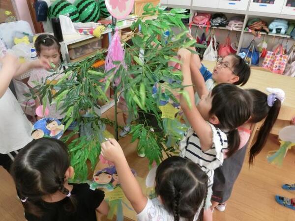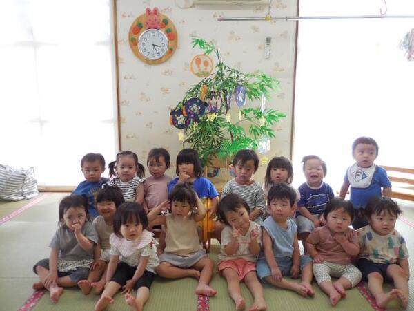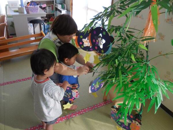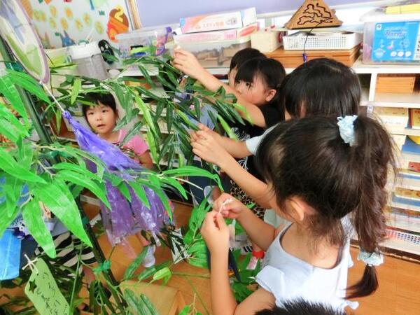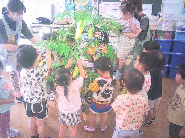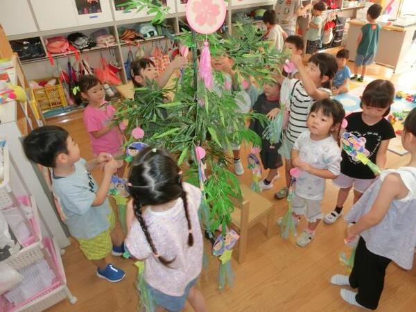 | 8月1日(金) ちゅうりっぷ・さくら・すみれぐみでも、一生懸命作った七夕飾りを飾りつけしました。 みんなのお願い事が届くといいね! |