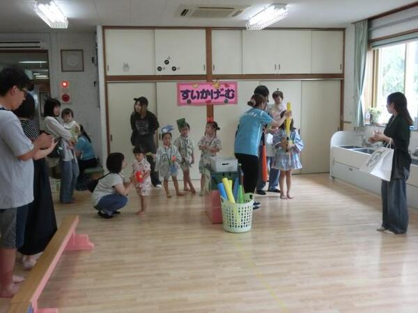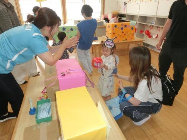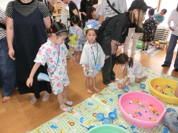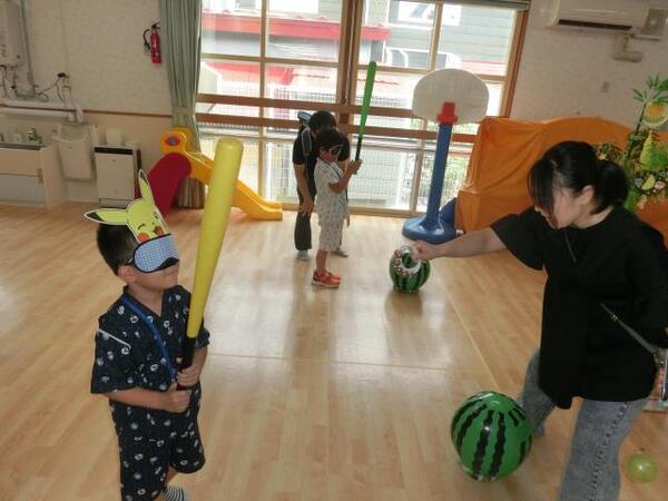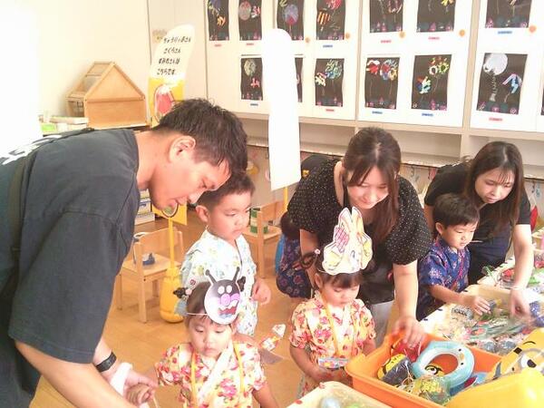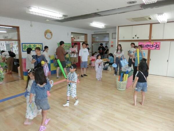| 8月2日(土) 今日はみんなが楽しみにしていた『ひかり縁日』を開催しました。 お父さんやお母さんと一緒に、笑顔で参加していた子ども達でしたね。 浴衣や甚平を着て、お祭りを楽しんでいるお友だちも多かったです。 卒園したお兄さんお姉さんも来園して、とても楽しい会になりました。 スイカゲームやおやつくじ、おもちゃくじとそれぞれのコーナーで、たくさんの笑顔を見ることが出来ました。 |