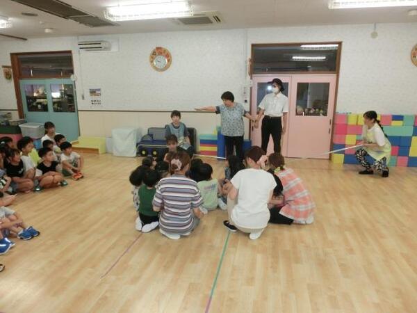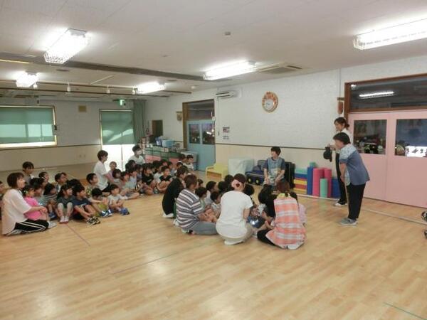 | 8月1日(金) 今日は避難訓練として、不審者が侵入した際の訓練を行ないました。 予告なしでの活動でしたが、窓の外に不審な人が立っていることに気が付いたお友だちは、すぐに先生に報告してくれました。 中に不審者が侵入してきた時は、ビックリしたお友だちもいましたが、先生のお話をよく聞いて騒がずに上手に避難していましたよ。 最後に不審者の正体が先生とわかり、一安心の子ども達でした。 不審者を捕まえる時に使用した『さすまた』も興味津々で眺めていましたよ。 |