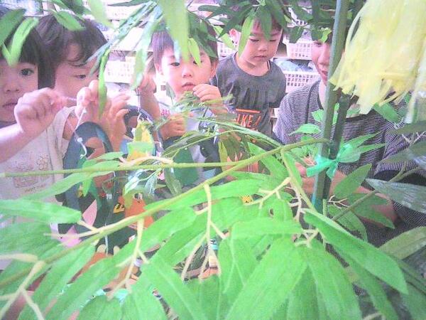 | 8月1日(金) 今日はみんなが頑張って作った、七夕飾りを木に飾りつけました。 ひよこ・つくし・たんぽぽぐみのお友だちも、背伸びをしながら飾っていましたよ。 |