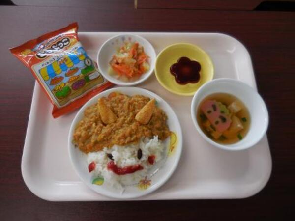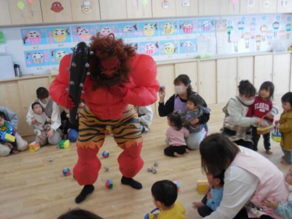 豆まきしたよ! 2月3日(火) 今日は節分で豆まきをしています。 ひよこ・つくしぐみは、つくし組のお部屋に集まりました。 「まめまき」の歌を歌ったり手遊びをしていると、どこからともなく太鼓の音が!! 赤鬼さんが登場するとビックリして泣いてしまうお友だちが多かったですが、果敢に豆を投げるお友だちもいましたよ。 自分の中の泣き虫鬼さんに「バイバイ」したお友だちもいて、みんな頑張りました。 今日の給食は鬼ランチということで、可愛い鬼のカレーも美味しくいただきました。 2026/02/03