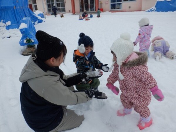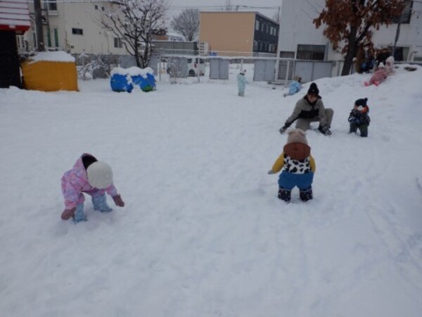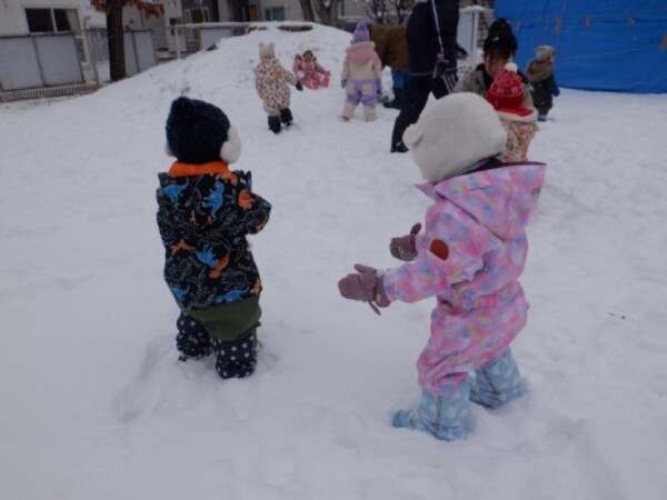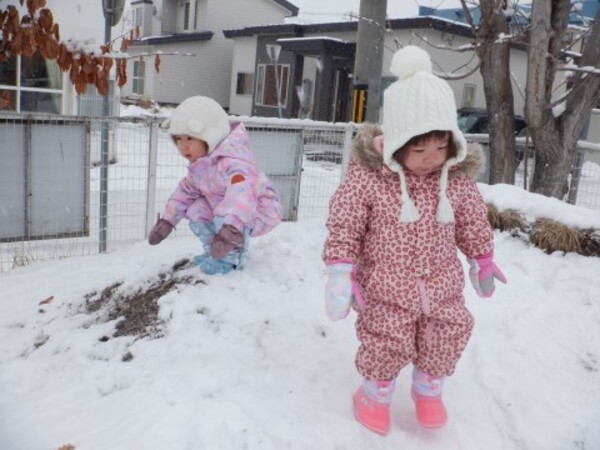 | 12月11日 木曜日 わあ〜!!雪だぁ!! 早速 ちゅうりっぷさんは雪遊びの準備をして お庭へGO! お山をお尻で滑ったり 雪をパラパラさせてみたり きゃあ〜!雪って冷たい 触ってみたり 丸めてみたり 雪の感触を楽しんできたよ♬ |