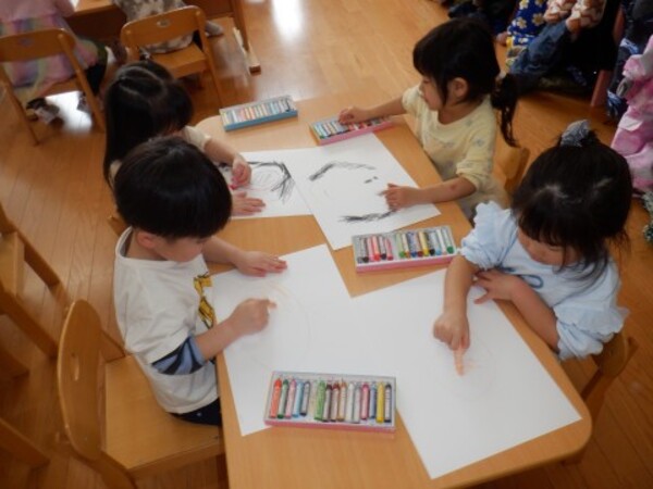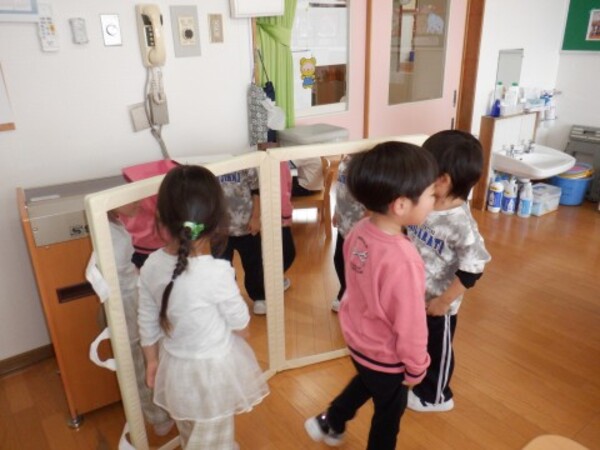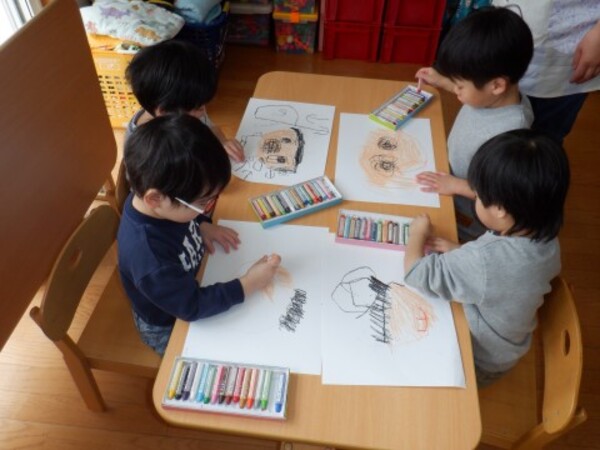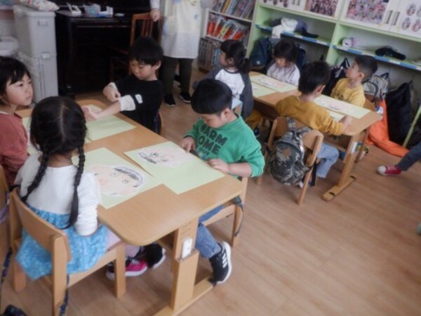 | 3月13日 金曜日 さくらさんは自分のお顔の絵 「自画像」を描きましたよ 大きな鏡を見ながら・・ 髪の色はどんな色かな? お顔は?鼻は? 鏡に映った自分の顔を見て どうだったかな? こうだったかな? 考えながら 鏡を見ながら 一生懸命描いて 自分の顔 完成!!やったぁ〜 その後はお庭で雪遊び 楽しかったね |