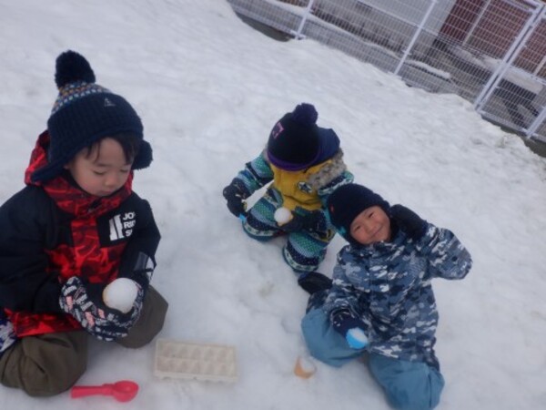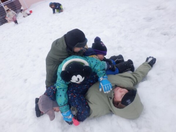 | 3月17日 火曜日 すみれさんは最後の雪遊び! 裏園庭で思いっきり 雪遊び! 何して遊ぶ? 雪合戦! おふろごっこ! ケーキつくる! いっぱいいろいろ沢山遊ぶよ 雪合戦から おしくらまんじゅうごっこ!? 先生をつぶしちゃえ!! ぎゅ〜ぎゅ〜!! 美味しいケーキも作ったり みんなでたくさん遊びました。 |