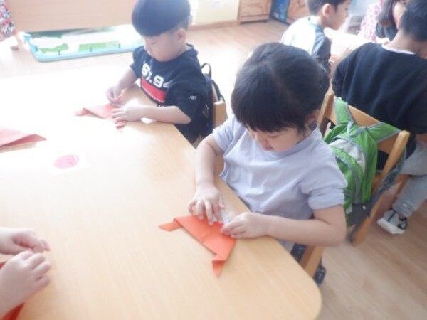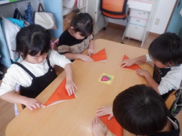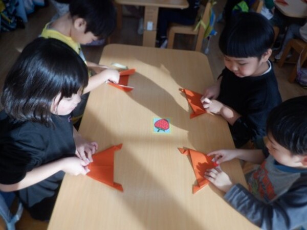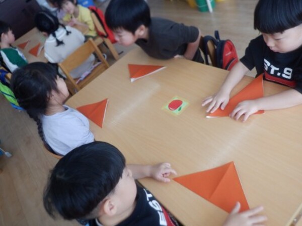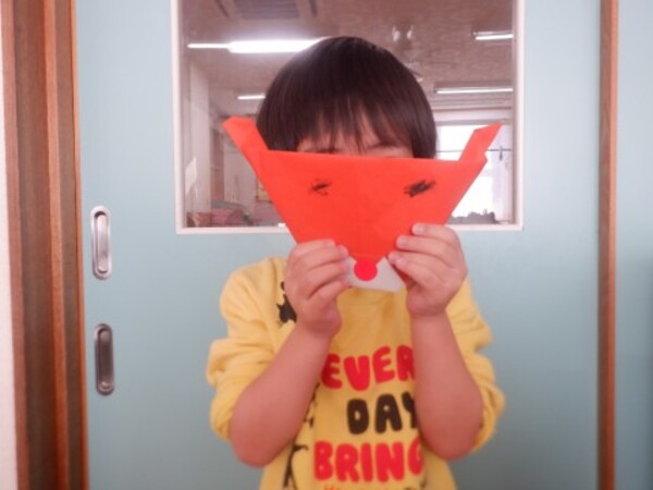 | 12月18日 木曜日 すみれさん 折り紙を折って 「トナカイ」の製作! 先生のお話しをよ〜く聞いて 三角に折って・・・ 小さく折って・・・ 折り返して・・・ トナカイの顔ができた! シールを貼って クレヨンで目を描いて 可愛いトナカイの出来上がり!! みんなでツリーに飾るよ♡ |