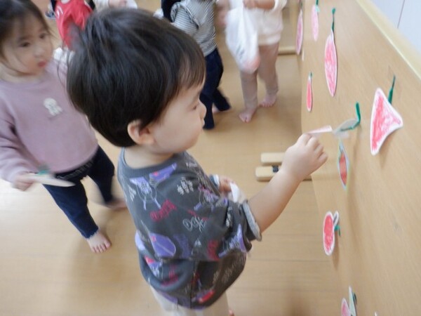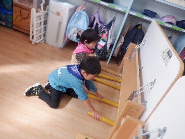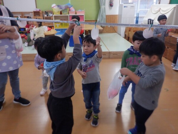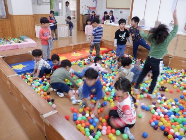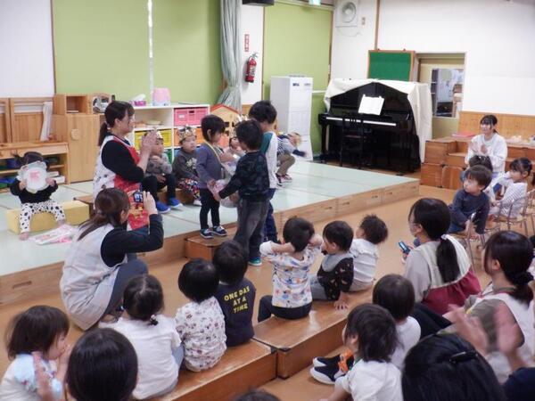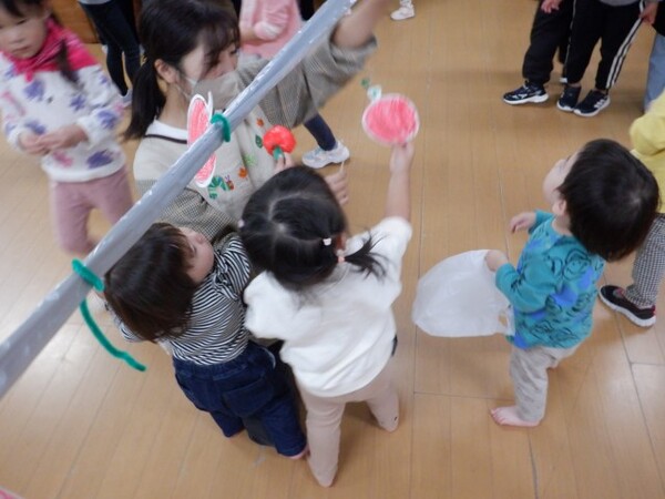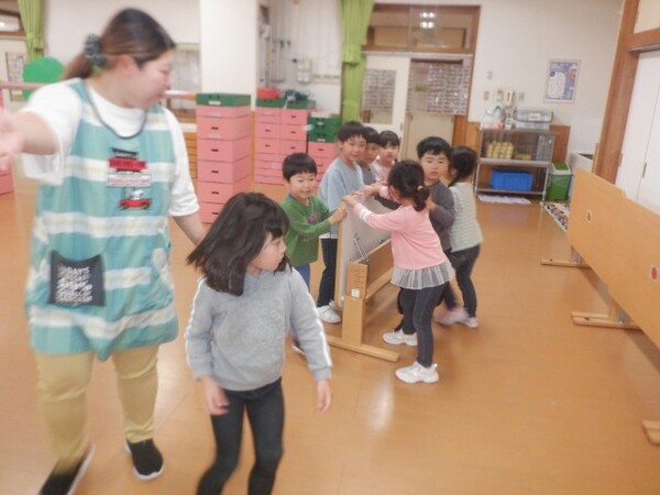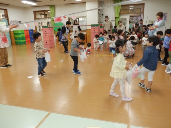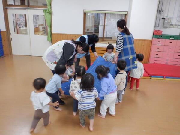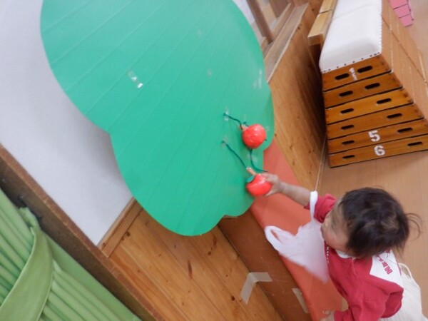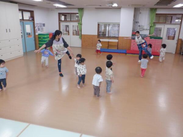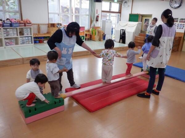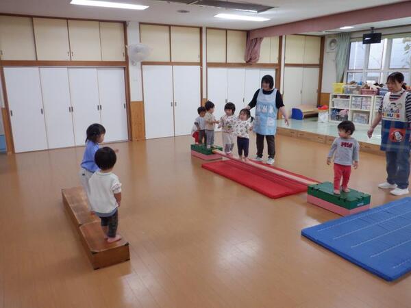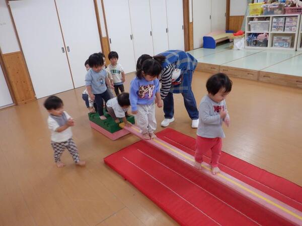 | 10月20日 月曜日 ちゅうりっぷさんは、お遊戯室で、 リズムあそび、ぴょんぴょん、はいはい、ころころ たくさん体を動かしたよ! そのあとは、平均台あそび。 初めは、先生と手をつないでいたお友だちも 繰り返すうちに、ひとりで渡れるようになったんだよ! すごいしょ‼ 最後に、マットのお片付けもしちゃったりして。 すごいね〜。 |