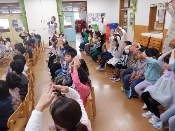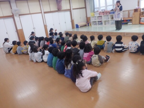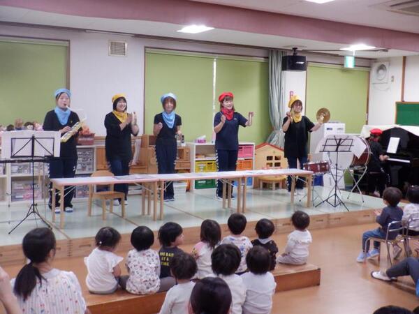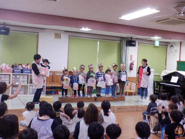 | 10月21日 火曜日 今日は、10月生まれのお誕生会が行われました。 みんな、上手にインタビューに答えることが出来、 プレゼントを、嬉しそうに受け取っていましたよ。 今月は、先生方の出し物で、めぐみ音楽隊の演奏会です。 すず、カスタネット、木琴、鉄筋、大太鼓、小太鼓など いろいろな楽器を演奏してくれましたよ。 ミッキーマウスマーチやどんぐりころころなど 楽しい演奏会となりました。 |