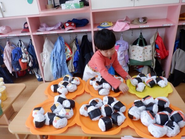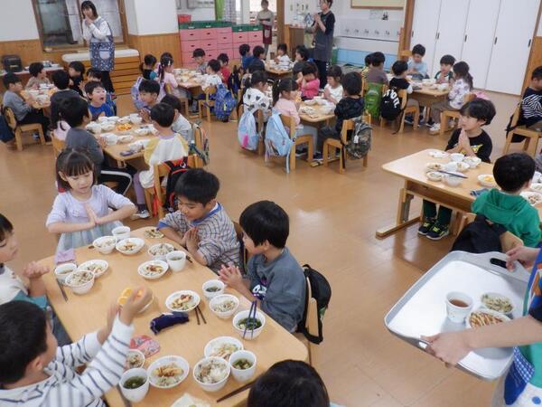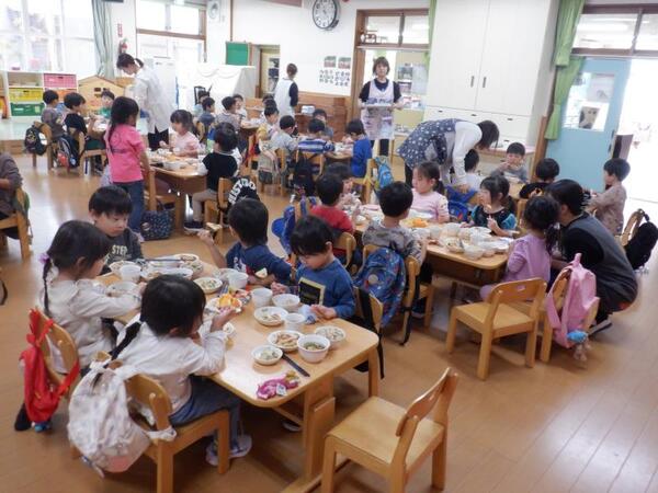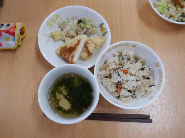| 10月21日 火曜日 今日の、お誕生会メニューは、 五目御飯、チーズはんぺんフライ、白菜のツナ和え すまし汁、オレンジです。 ゆりさん、すみれさん、さくらさんは、 お遊戯室に集まって会食です。 やっぱり、みんなで食べる給食は、 うれしい、たのしいね〜♡ |