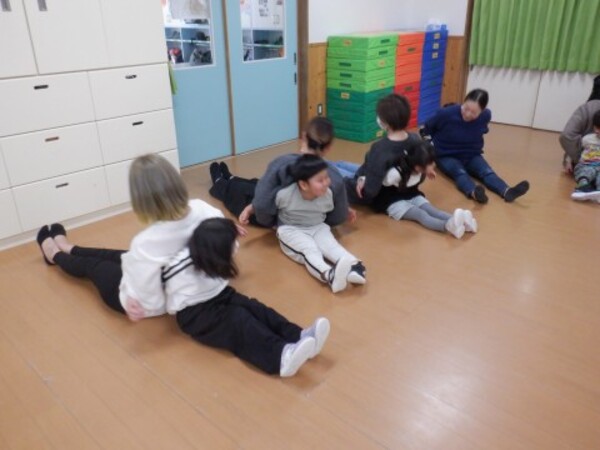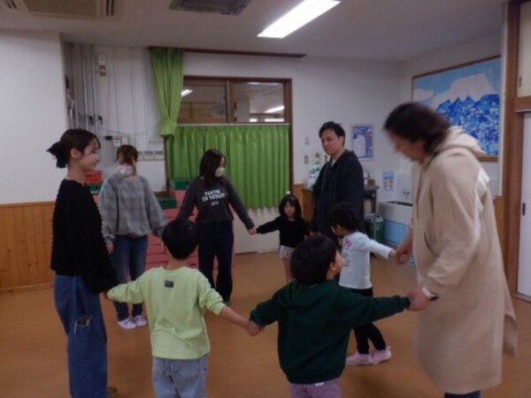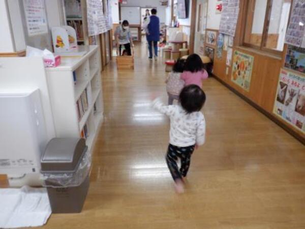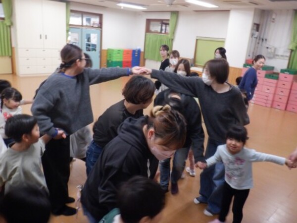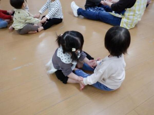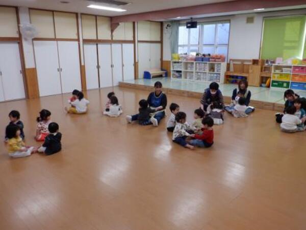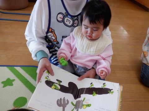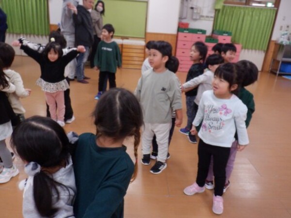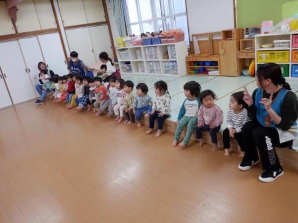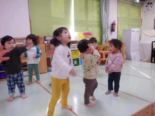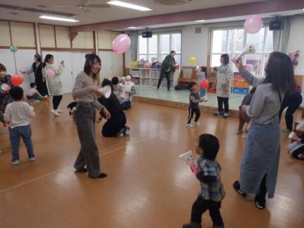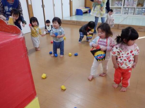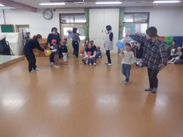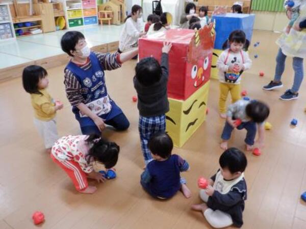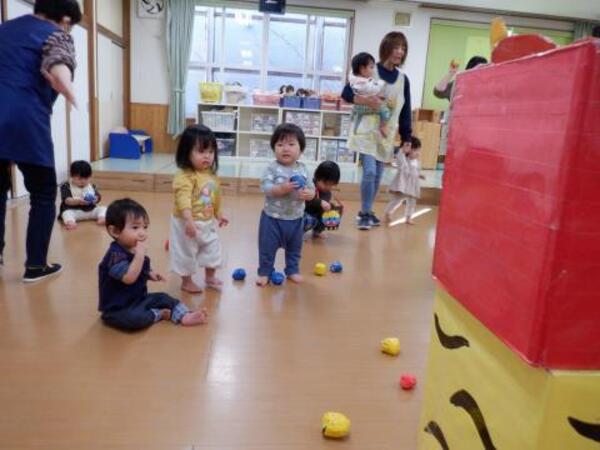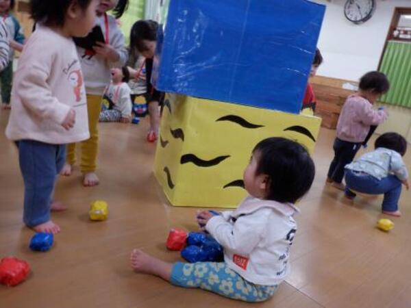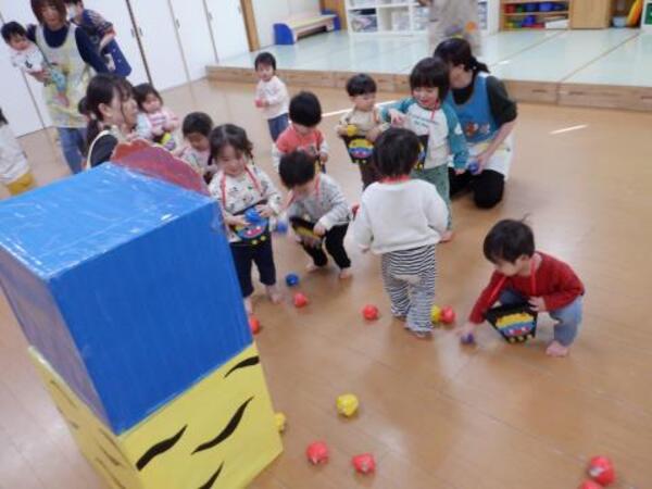 | 1月27日 火曜日 今日は、0歳児の女の子が遊びに来てくれました。 ももさんと、ちゅうりっぷさんが、お遊戯室であそんでいたので 一緒に、入れてもらってあそびましたよ。 リズム運動や豆まきごっこに参加しました。 来園ありがとうございます。 また、来て下さいね。 |