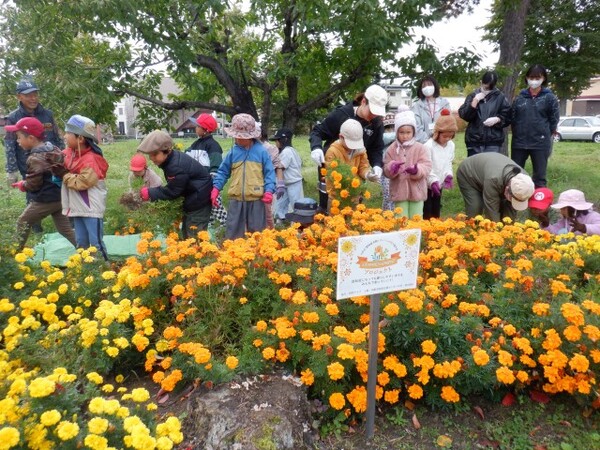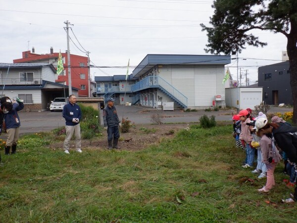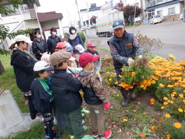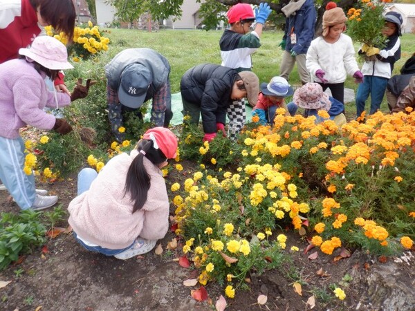 | 10月16日 木曜日 ゆりさん 今日は 世代間交流 春に植えた花壇のお片付け おじいちゃんやおばあちゃんと一緒に お片付けするよ〜 春のお花きれいだったね〜 |