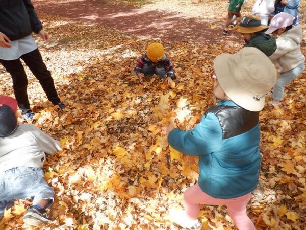 | 10月20日 月曜日 さくらさんは、秋を探しにでかけました。 遊歩道には、ありましたよ〜。 木々が色づいて、落ち葉がどっさりありました〜。 さっそく、落ち葉シャワー!わーい! 赤い葉っぱで、カードごっこ!わーい! なんだか、とっても楽しかったね。 また、行こうね〜。 次はどんな秋になっているかな? |