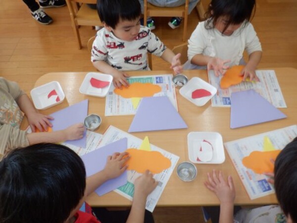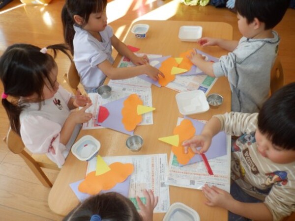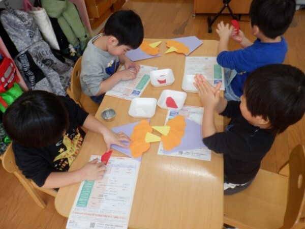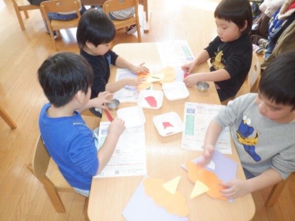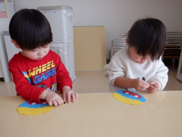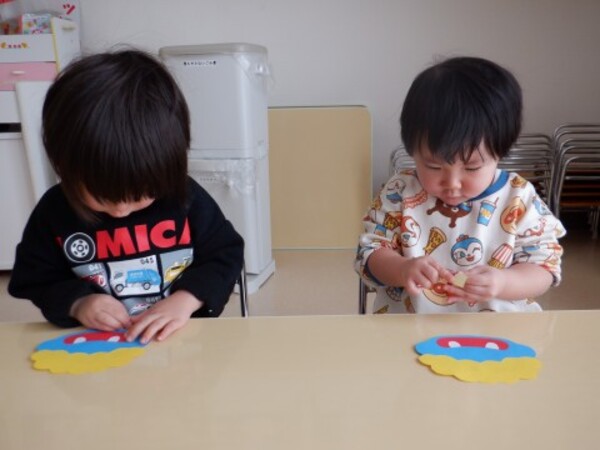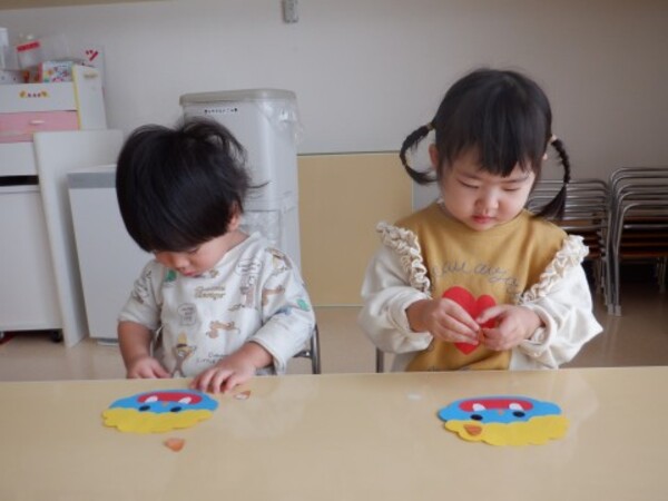 | 1月22日 木曜日 今日は お部屋で鬼の顔を作ったよ シールをペタンと貼って 両面テープ剥がしにも 挑戦したちゅうりっぷさん 目はどこかな? ここ!だぁ 口はどこかな? ここかな? 表情豊かな顔ができました。 |