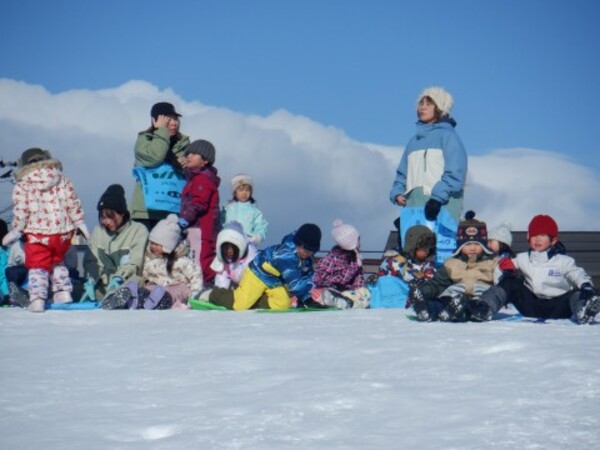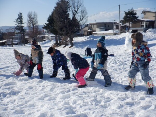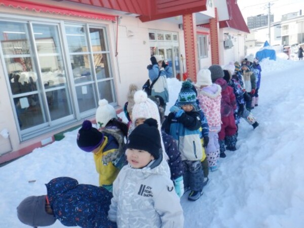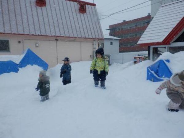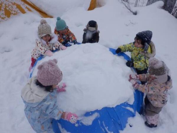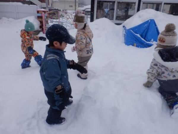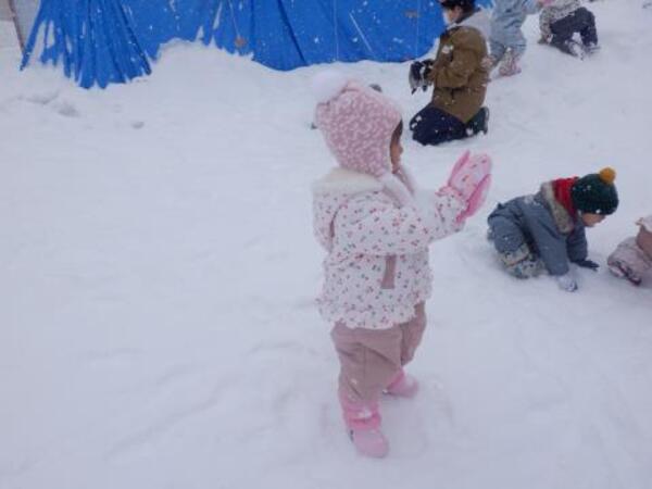 | 1月28日 水曜日 朝から、ちらちら雪が降りました。 たんぽぽさんは、雪の中園庭にレッツゴー‼ たくさん歩いて、お山にのぼって、お尻で滑って 雪玉作って、雪のかたまりパンパンして みんなで、いっぱい楽しみましたよ〜♪ |