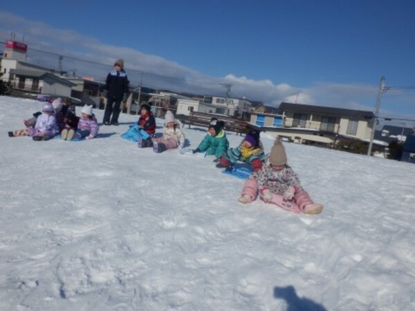 | 1月23日 金曜日 今日はすみれさんとゆりさんと一緒に 美芳第一公園へレッツゴー!! 公園のお山から 滑るよお〜!! きゃあ〜!おもしろい! みんなですべるよ〜 また お尻滑りに行こうね♪ |