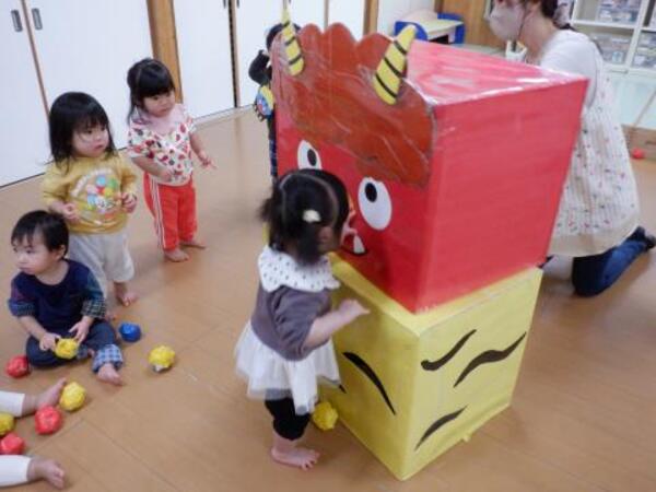 | 1月27日 火曜日 今日は、ももさんと一緒に、お遊戯室にてあそびました。 手あそび、リズム運動と張り切って参加していますよ。 ピアノの音楽に合わせて体を動かすことが、 とっても上手になっています。 その後は、豆袋に作った豆を入れて 豆まきごっこのはじまりはじまり〜。 豆まきも、密かに上手になっています! 節分が、楽しみだね〜♪ |