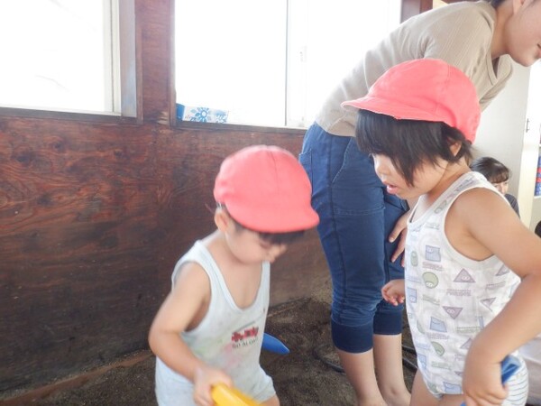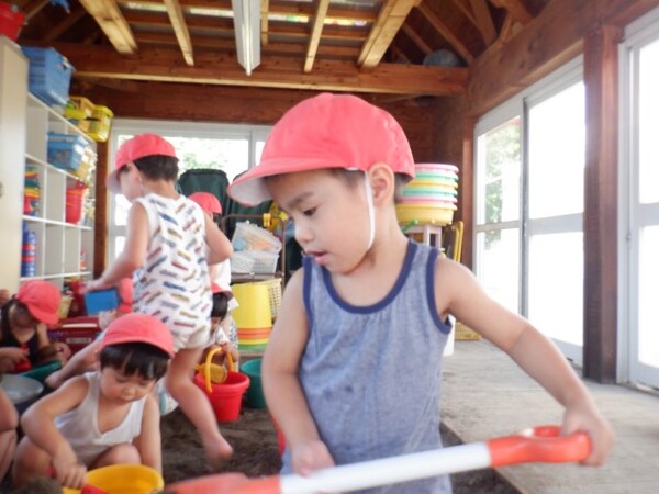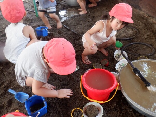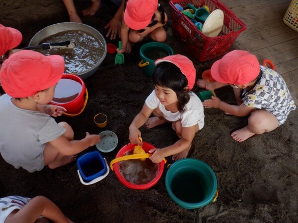 | 8月1日 金曜日 さくらさんは お砂場で タライにお水をいっぱい溜めて・・ 砂水遊び バケツやスコップで 穴を掘ったり・・ ジュースを作ったり お団子を作ったり お友達と一緒に 砂水遊び♡ 先生も一緒に穴掘りしたよ〜 |