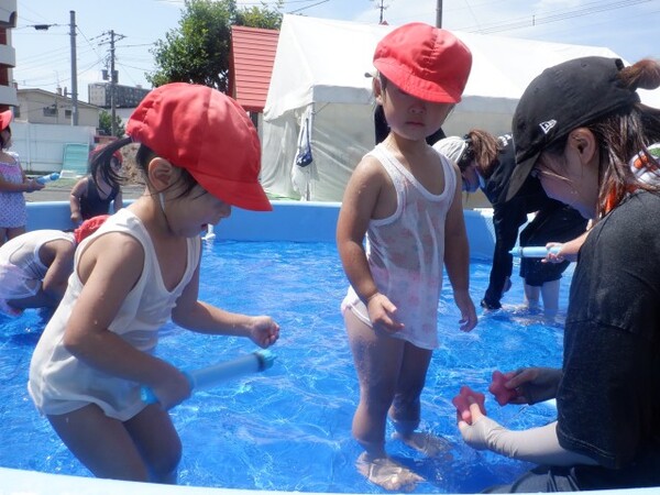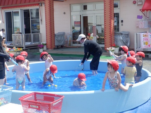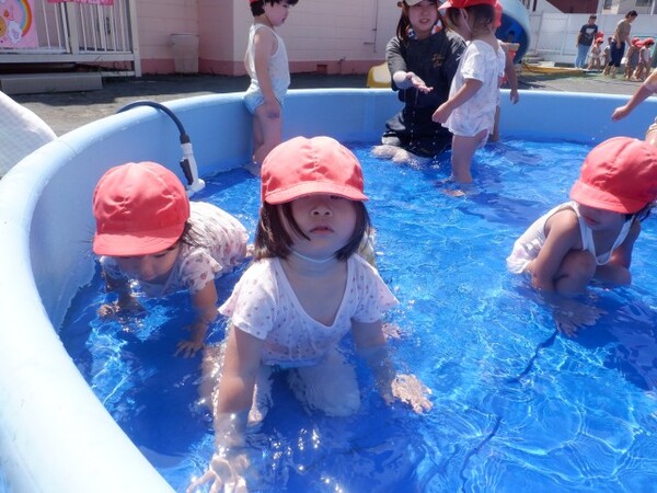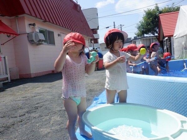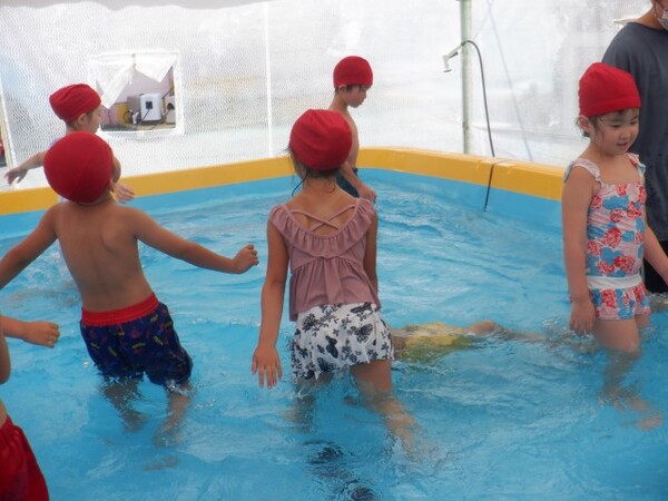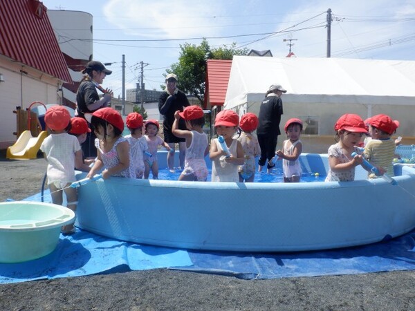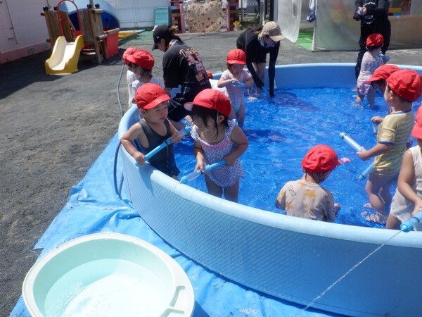 | 8月1日 金曜日 おおきなプールに中にジャブ〜ン!! お魚さんになった たんぽぽさん みんなでジャブジャブ 水遊び♬ たのしいな 楽しいな水遊び 水鉄砲でも遊んだよ〜 |
