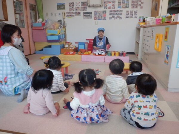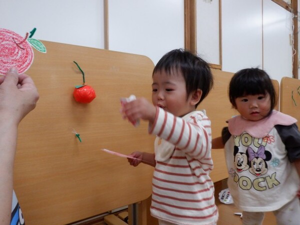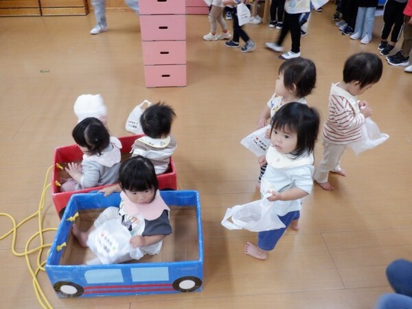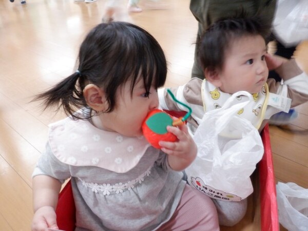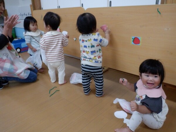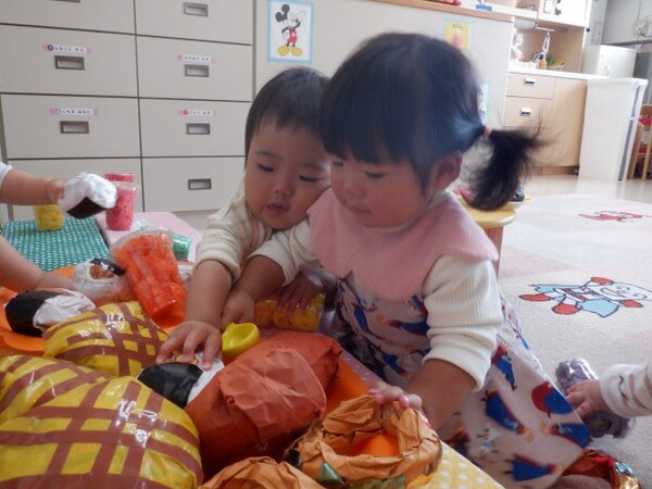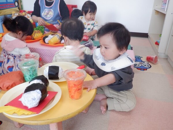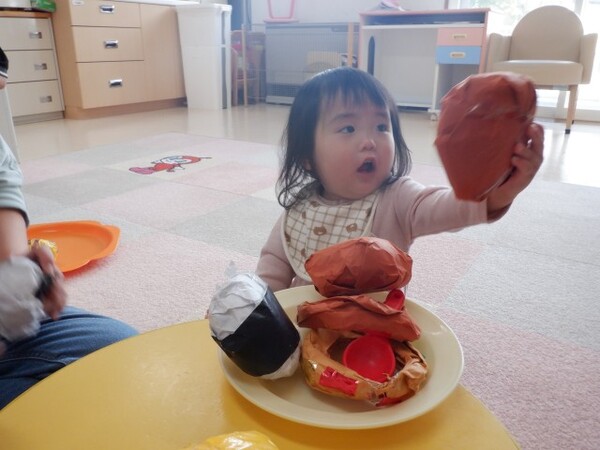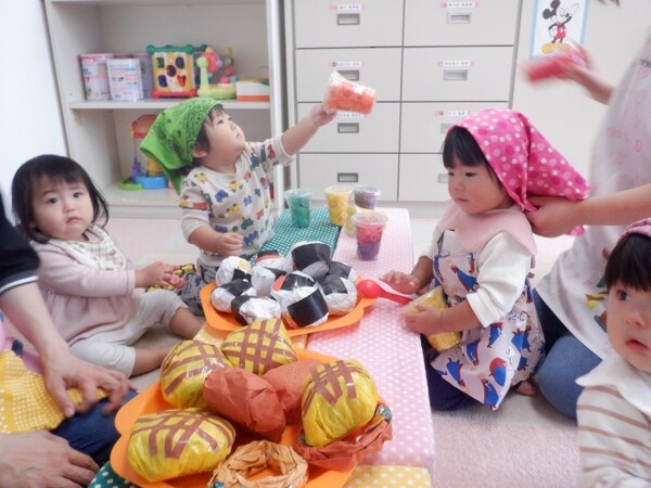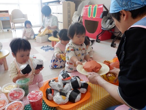 | 10月10日 金曜日 ももさんのお店屋さんがオープンしたよ いらっしゃい!いらっしゃい! おにぎり、ジュース、ポテトにパン! お店屋さんになったり お客さんになったり みんなでパクパク 楽しかったね♪ |