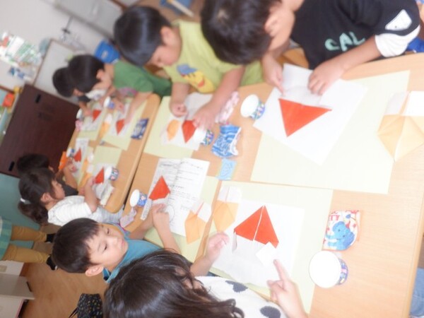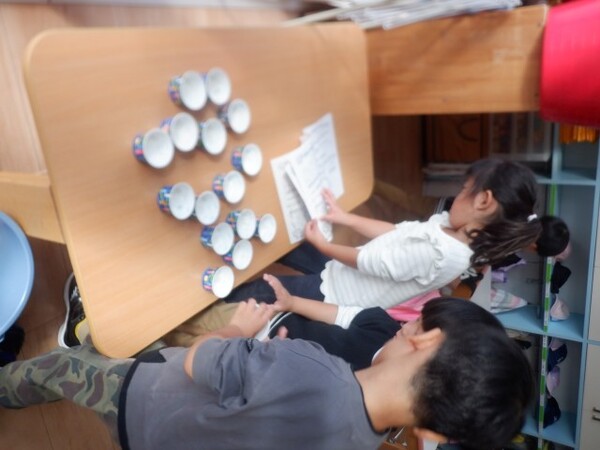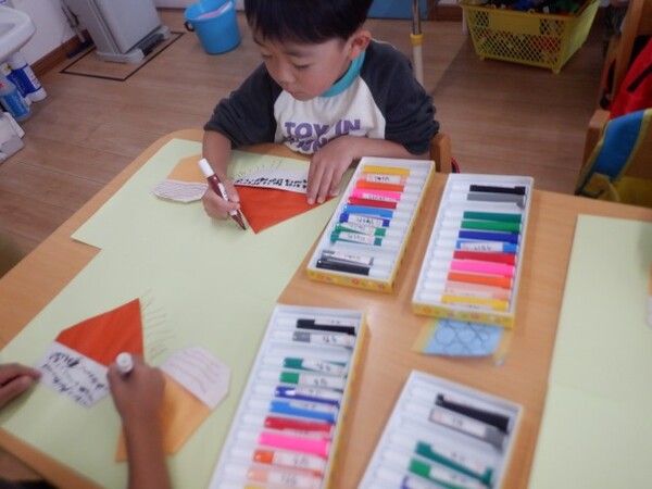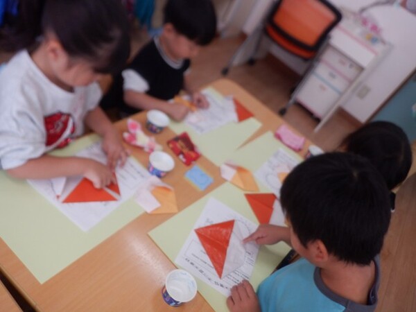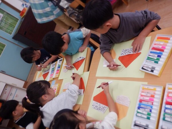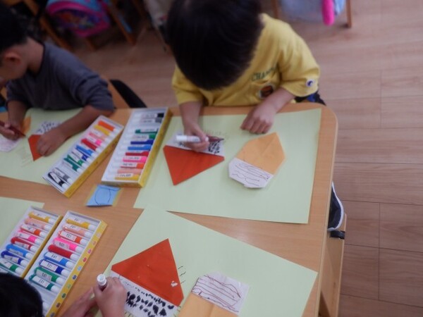| 10月10日 金曜日 すみれさんは秋の味覚の製作 クリとどんぐりを作りましたよ 折紙で丁寧に作って のりづけして マーカーで クリのイガイガも描きました。 のり付けの準備は自分たちで用意 台紙やのりの準備も上手になりました。 |