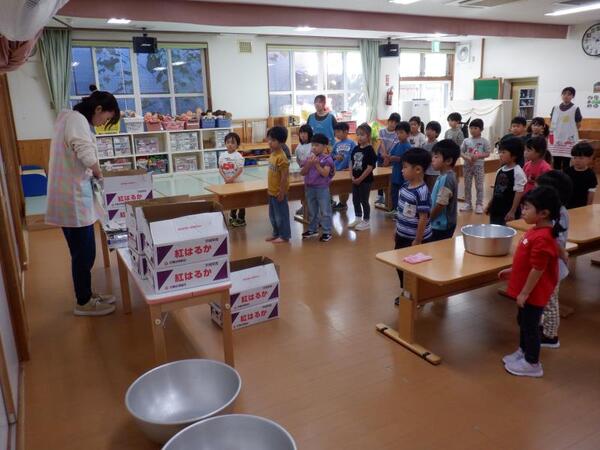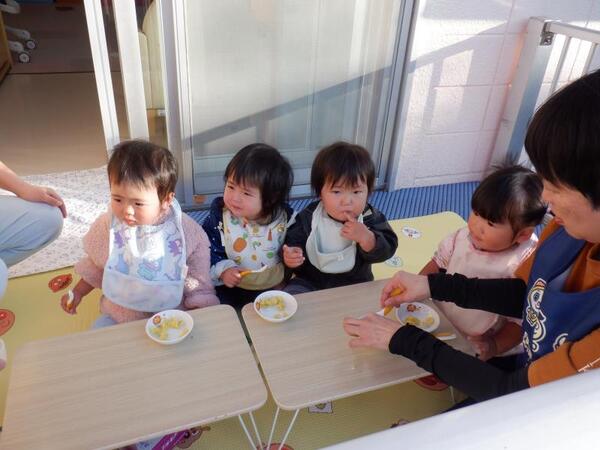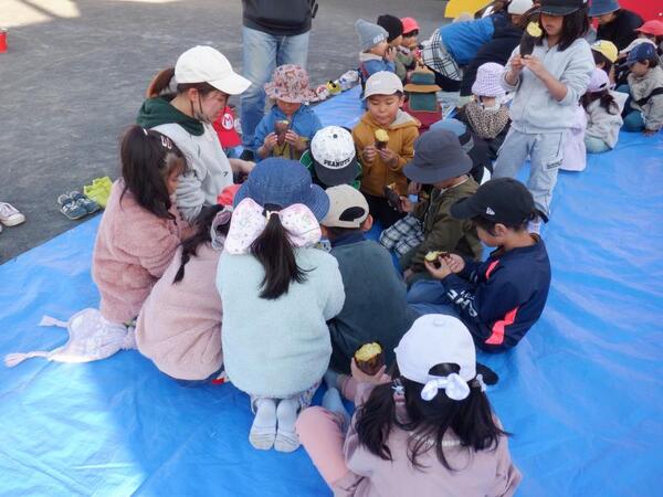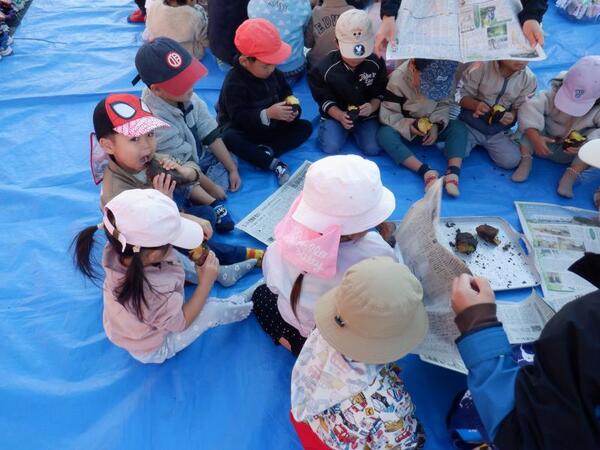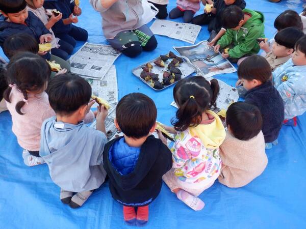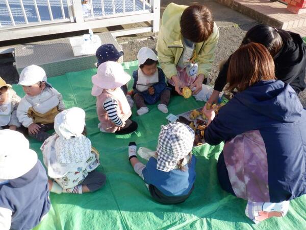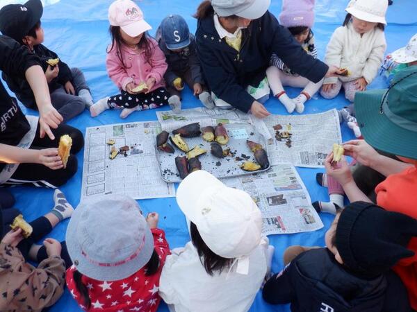 | 10月14日 火曜日 さあさあ、おやつタイムです。 今日は、お天気良く暖かかったので、 みんなで、園庭でいただきました。 熱々ホカホカ出来立てのやきいもは おいしいね〜♡ ゆりさん、ありがとう! |