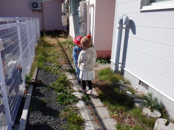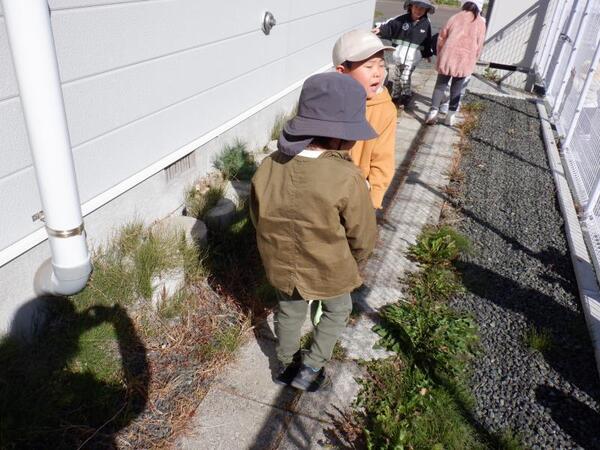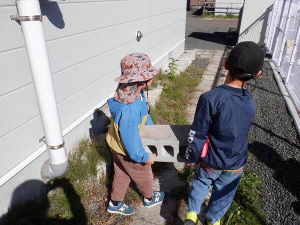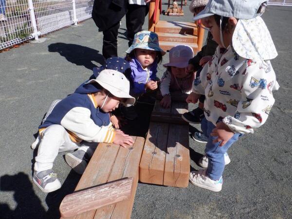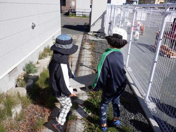 | 10月14日 火曜日 アルミホイル包みが終わってから ゆりさんは、園庭に出てお芋を焼く場所作りです。 コンクリートブロックをみんなで運んで 枠をつくりました。 焚き木も運んで、枯葉も運んで、準備OK! 給食を食べを終わってから、 焼きますよ〜。 |