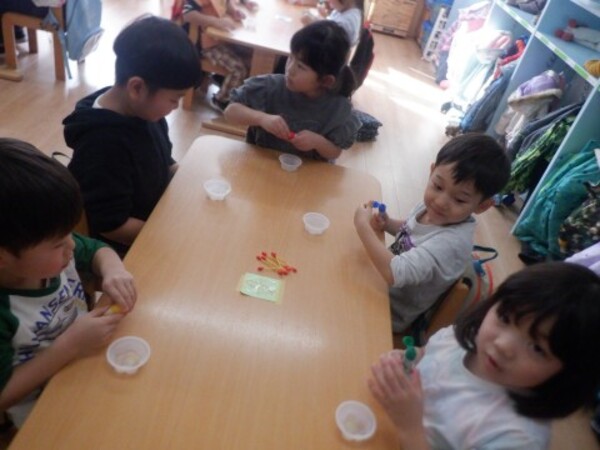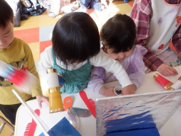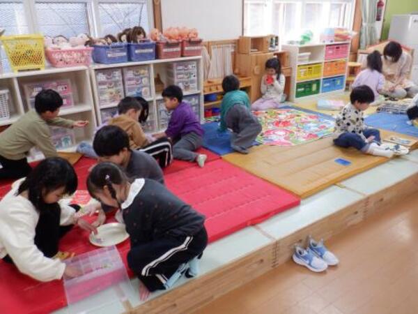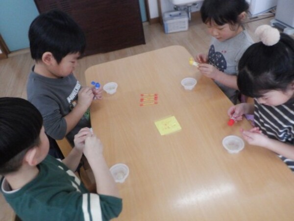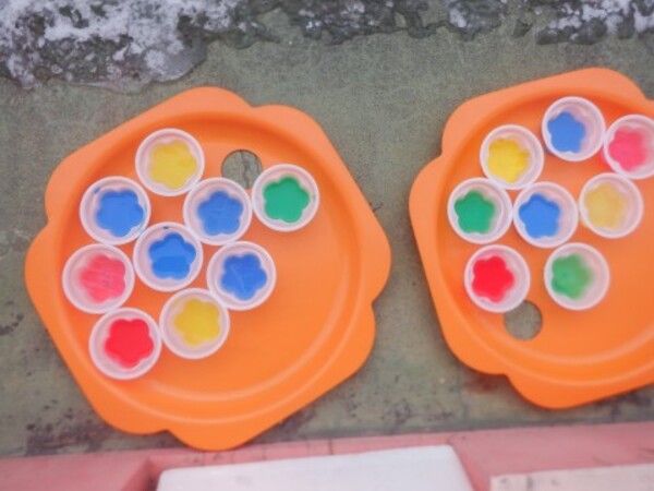| 1月16日 金曜日 すみれさんは昨日のお約束 「色氷つくり」 どの色にする? どれがいいかな・・・? 絵の具をカップに入れて お水を入れて くるくる混ぜて・・ 色氷の出来上がり! 楽しみだね その後は豆の袋つくり 鬼の顔のパーツを描いて切って・・ 怖い鬼にする? キバは? いろいろな顔の鬼が 出来たよ! これで節分は大丈夫!? |
