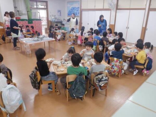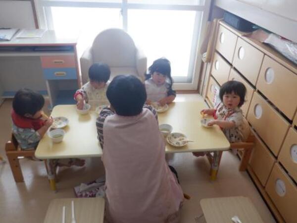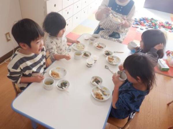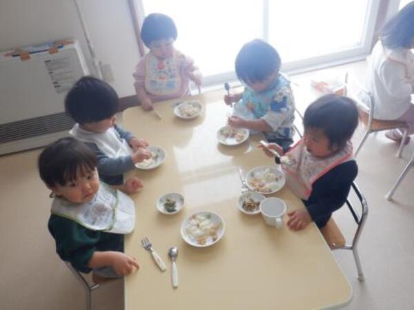 | 1月21日 水曜日 今日のお誕生会メニューは、エビピラフ、スープ タンドリーチキン、ほうれん草のツナ和え 豆乳プリンです。 ももさん、ちゅうりっぷさん、たんぽぽさん 上手に食べられるようになっていますよ。 ゆりさん、すみれさん、さくらさんは お遊戯室で会食です。 みんなでお話ししながら、楽しく食べました。 |