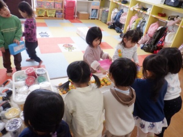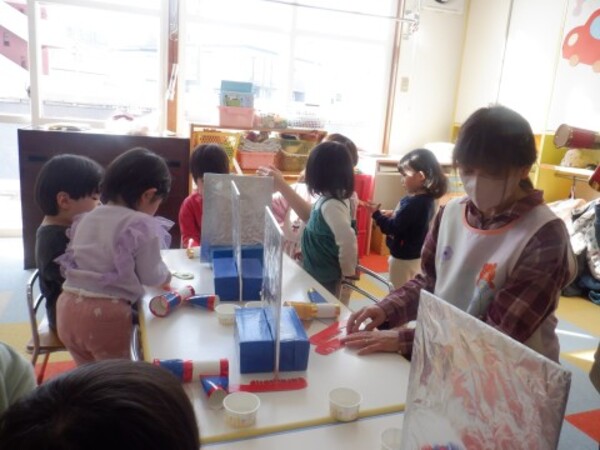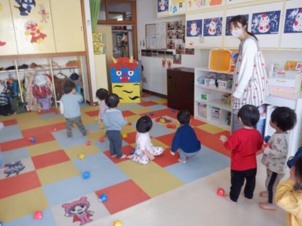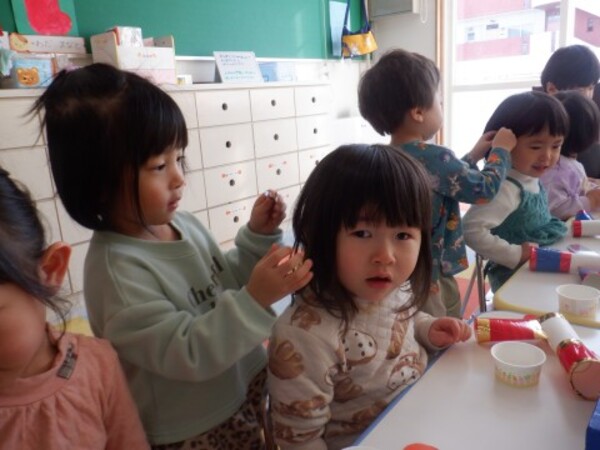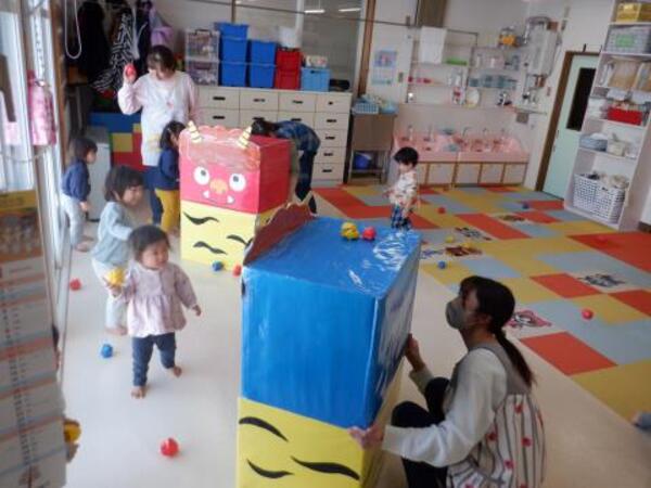 | 1月19日 月曜日 ちゅうりっぷさんは、新聞紙を使って、豆まきの豆作りをしましたよ。 新聞紙を、ぎゅぎゅっと丸めて、ガムテープでくるくるして出来上がりです。 おや?箱鬼さん登場ですね。 おにはーそと!ふくわーうち!豆まきが上手になっている ちゅうりっぷさんでした。 |