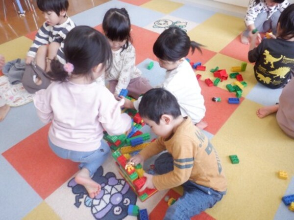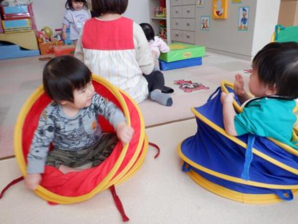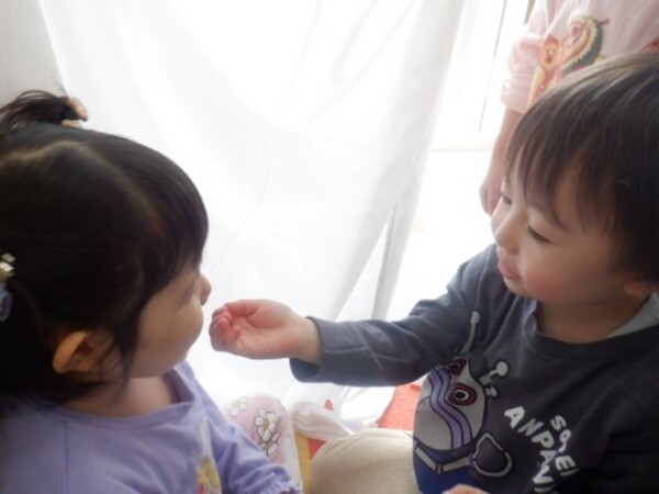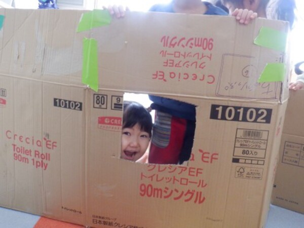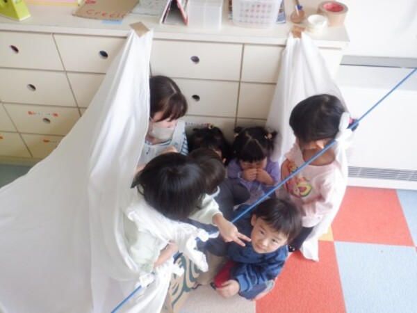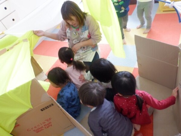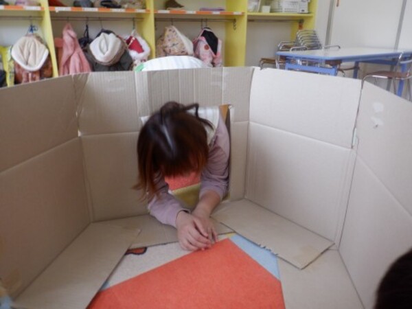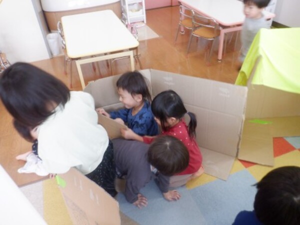 | 2月27日 金曜日 段ボールと布を使って お家を作ったよ 早速 みんなで「おうちごっこ」 ドアも作って 中に入ったり 出てみたり 窓からのぞいて 「こんにちわ!!」 みんなでお家ごっこ 楽しかったね♪ |