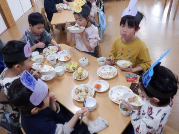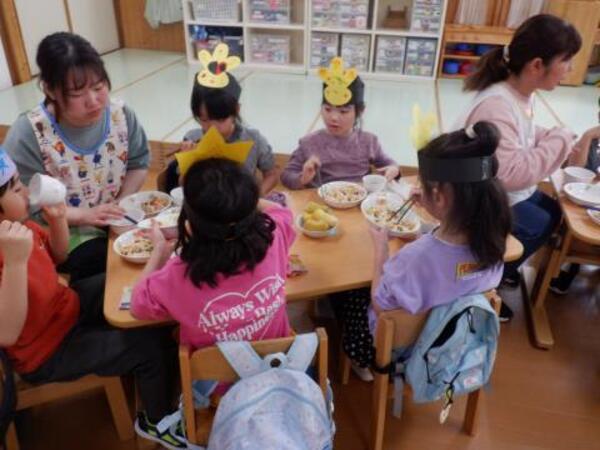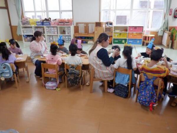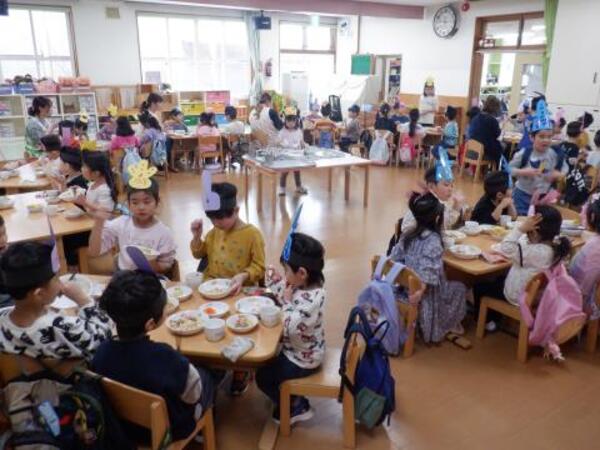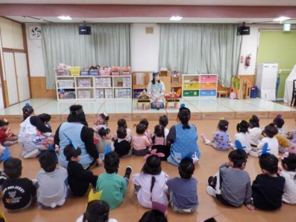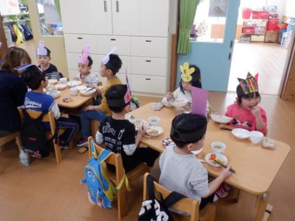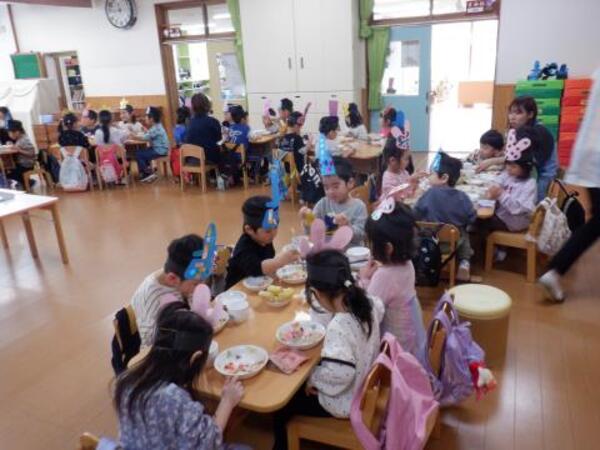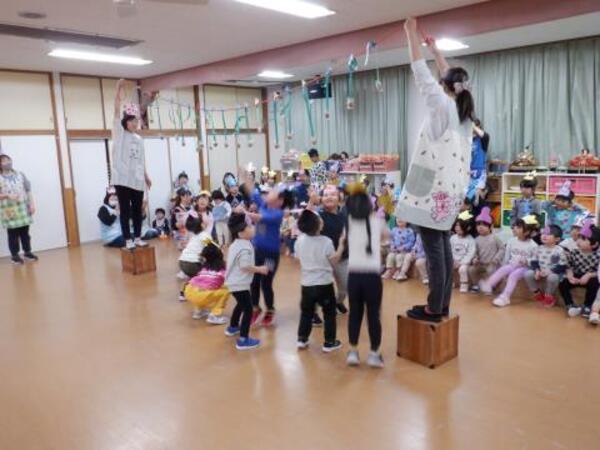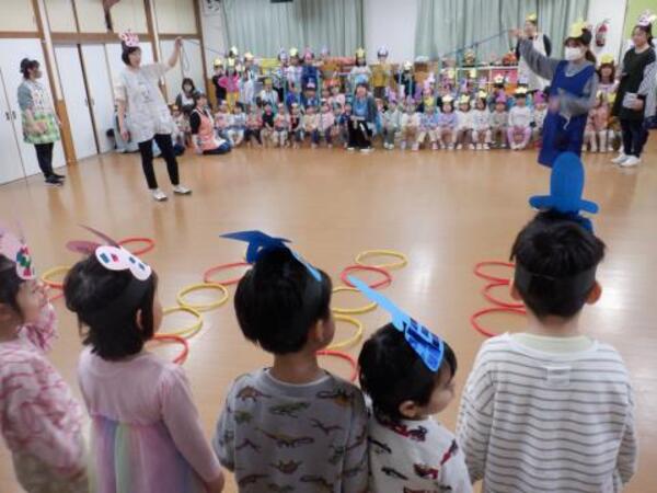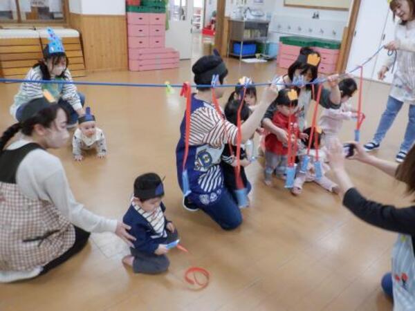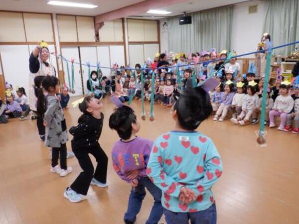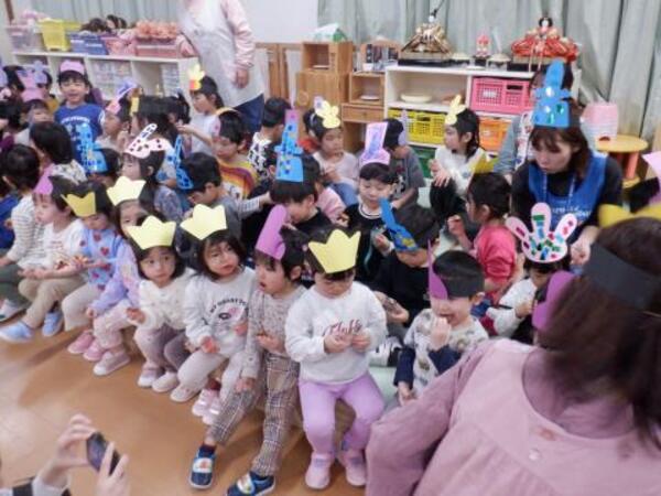 | 3月3日 火曜日 今日は、ひなまつり。みんなお遊戯室に集まってお祝いをしましたよ。 みんなが、お内裏様、お雛様になって、先生のお話しを聞き、 クラスごとに、ドーナッツ取りゲームをしました。 兎ジャンプをしたり、けんけんぱをしたり、巧技台を超えたり リンボーしたり、いろいろしながら紐にさがったドーナッツを取りましたよ。 先生もカタツムリ漕ぎ漕ぎ、手を使わないガブで参加しました。 かなり盛り上がった、ひなまつりとなりました! |