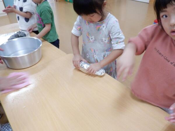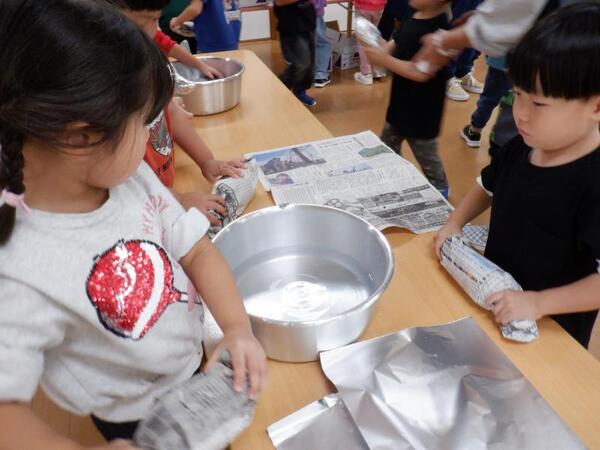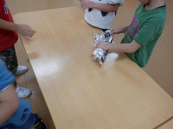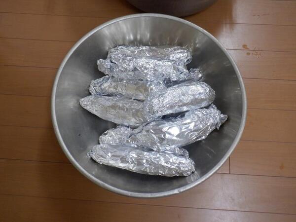 | 10月14日 火曜日 午前中、ゆりさんすみれさんは、お遊戯室にて やきいもの準備です。 さつまいもを、新聞紙でくるんで、お水につけて アルミホイルで包みました。 さあ、みんながお昼寝の間、ゆりさんが、 焼きますよ〜! |