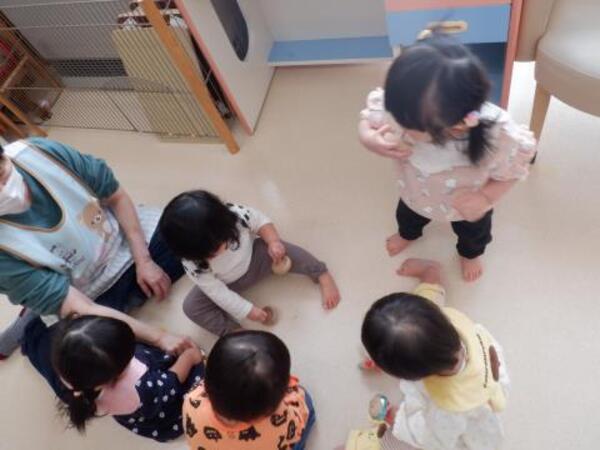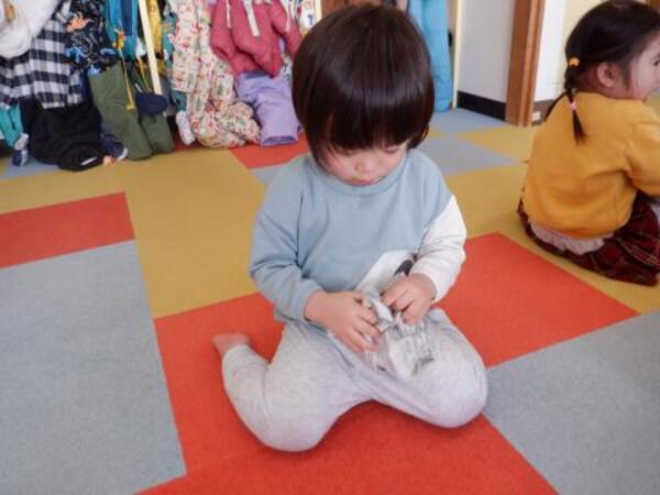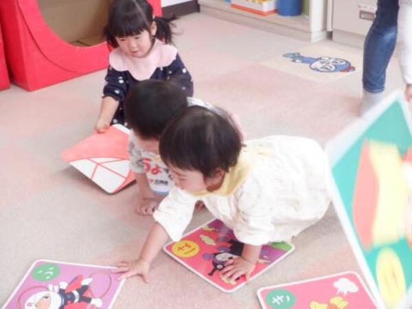 | 1月20日 火曜日 ももさんは、初めてカルタをしてみましたよ。 おおきくて、ももさん大好きなアンパンマンカルタだったので みんな、よろこんでいました。 コマもさわってみて、くるくる回る不思議なものに 興味津々。回そうとしてみる姿も・・・! 面白体験したももさんでした。 |