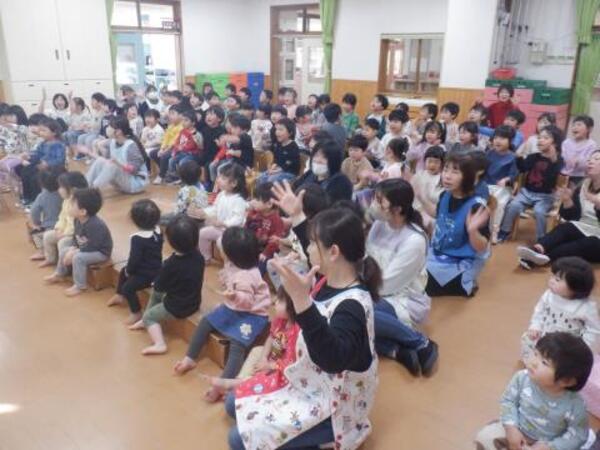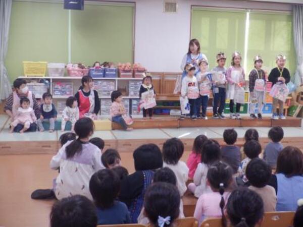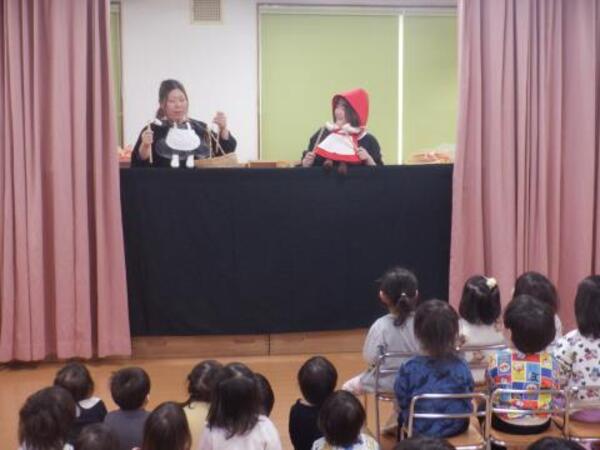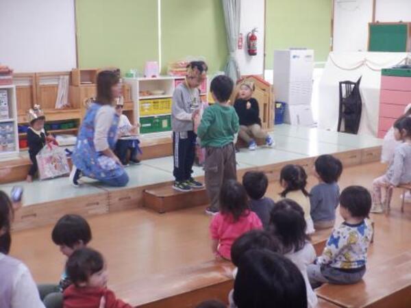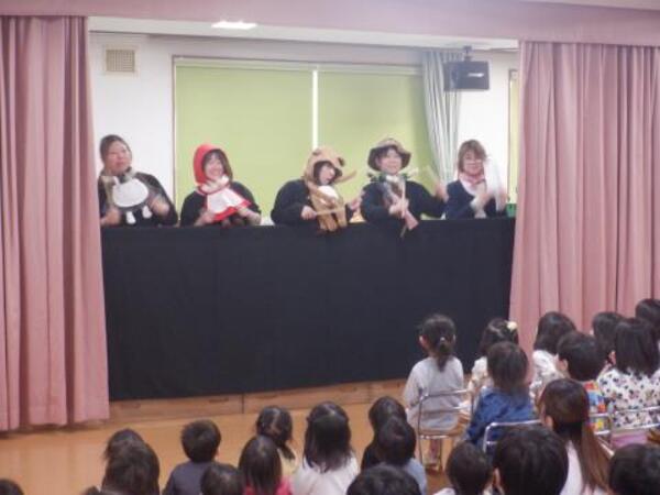 | 1月21日 水曜日 今日は、1月生まれのお誕生会。お誕生日のお友だちは、 ドキドキしながらステージに立ちましたよ。 みんなでインタビューして、上手に答えることが 出来ました。 プレゼントをもらってみんなニコニコ♡ 今回の出し物は、先生方のフェイスパペット 『あかずきん』です。 みんな大喜びで、拍手喝采‼ 面白かったね〜♡ |