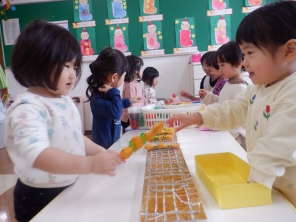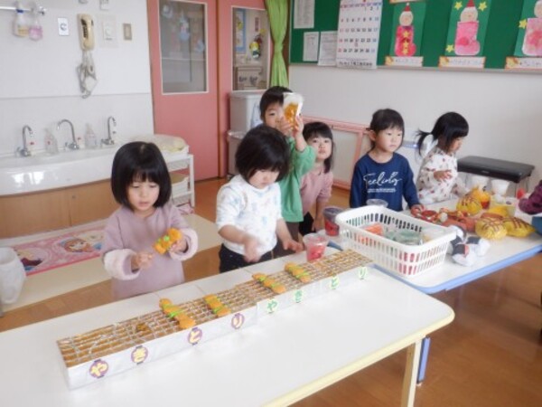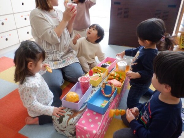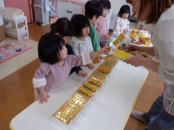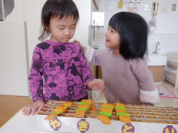 | 1月22日 木曜日 ごっこ遊びが大好きなたんぽぽさん 今日は食べ物屋さんごっこ! パンにやきとり、ジュース いらっしゃい いらっしゃい 美味しいパンがありますよ やきとりはどうですか? 店員さんやお客さんになって みんなであそんだよ〜♬ |