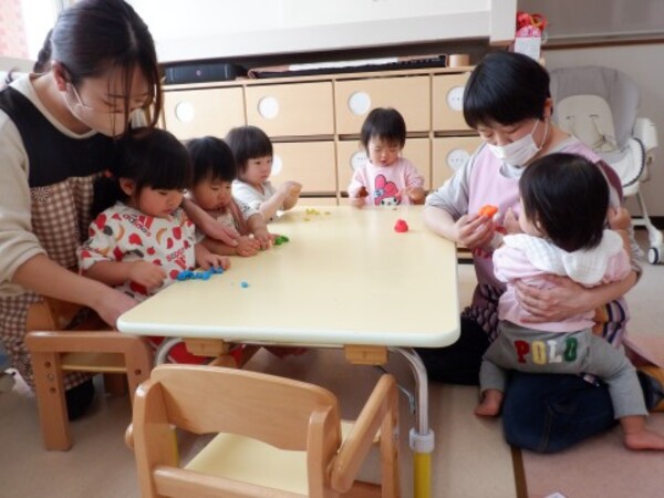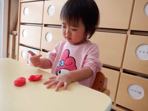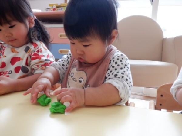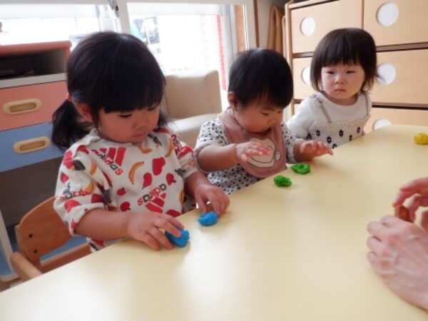 | 2月27日 金曜日 ももさん 初めての米粉粘土! いろいろな色があるよ 粘土の感触 ドキドキ♡ わあ〜柔らかい! ぷにゅぷにゅ! ぎゅぎゅって触ってみたよ 伸ばしたり 丸めたり 先生と一緒に コロコロコロ・・・ ちょっぴり ドキドキだったけど 楽しかった♬ |