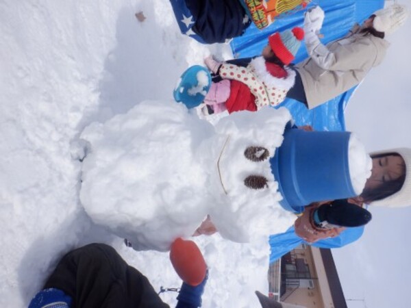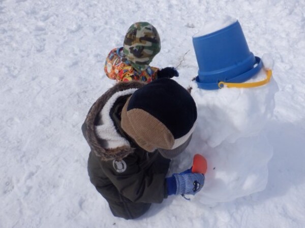 | 3月5日 木曜日 今日はお庭で雪遊び 今日の雪は ぎゅぎゅって 雪玉が出来るんだ! みんなで可愛い雪だるまを作ったよ 青いバケツをかぶせて 完成! |