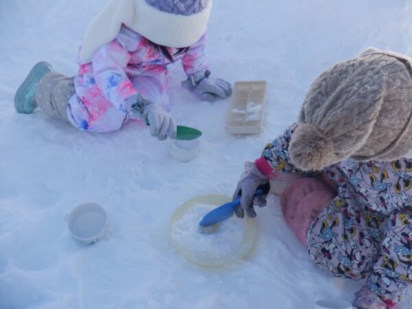| 1月15日 木曜日 ゆりさん 今日は氷つくり カップに水を入れて ここまでかな・・・? どこまでかな・・・? おっとっとっと! あふれちゃう!! 慎重に慎重に お外に置いたよ 雪遊びしていても 「こおり出来たかな?」と ワクワクしていたゆりさん 園庭遊びも楽しかったよ♬ |