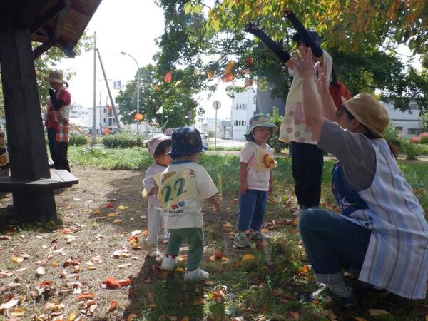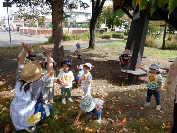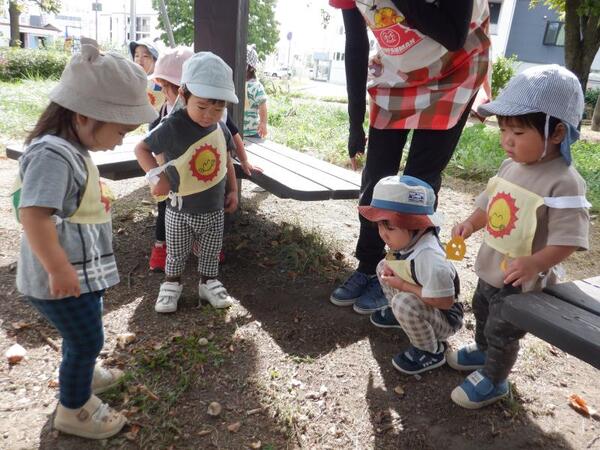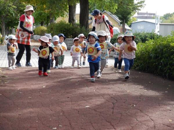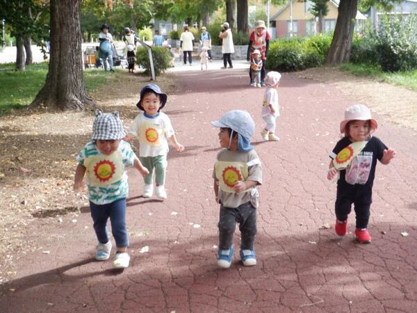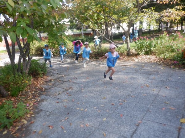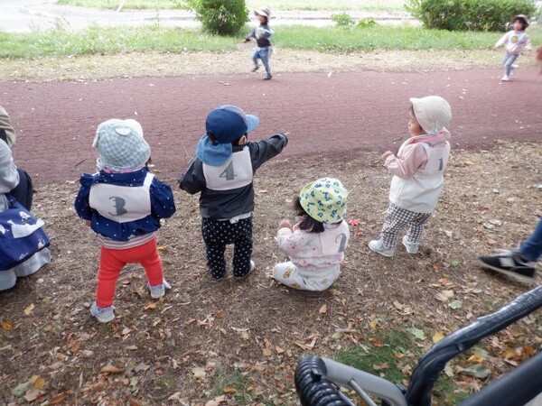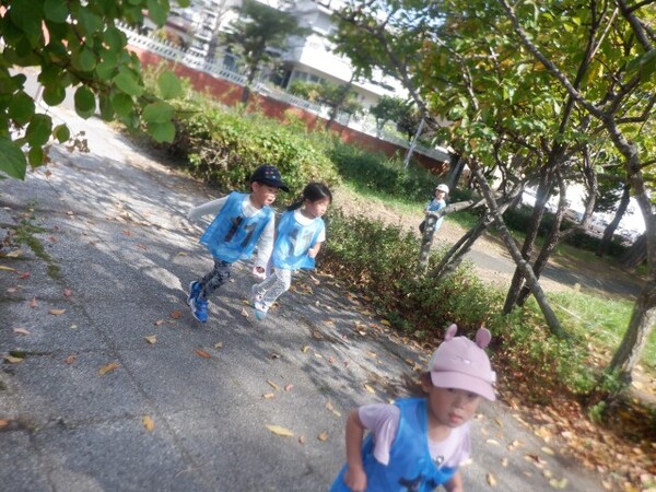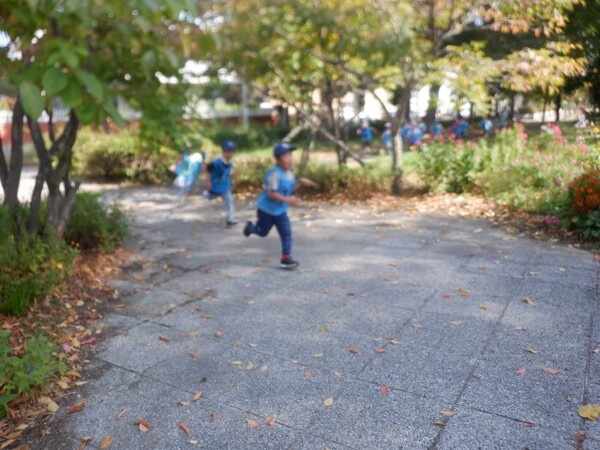 | 10月1日 水曜日 ちゅうりっぷさんは、まらそんごっこで使う ゼッケンをつけて、遊歩道まで歩いて マラソンコースにて、走ってみました! みんな、笑顔で走りましたよ〜! ちゅうりっぷさん!がんばる! そのあとは、葉っぱを散らしてあそんだり 秋の探索楽しみました〜♪ |