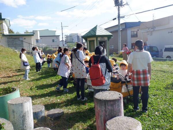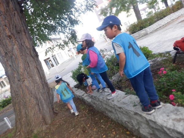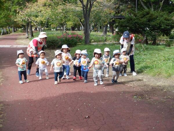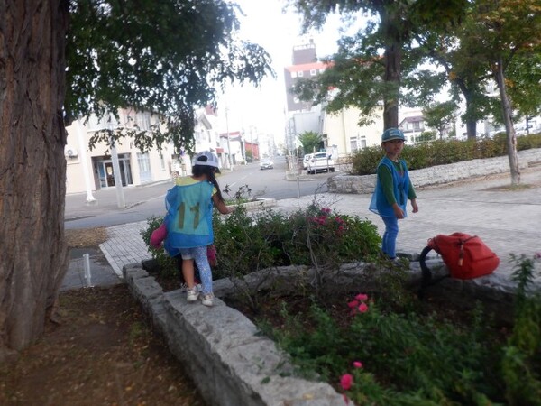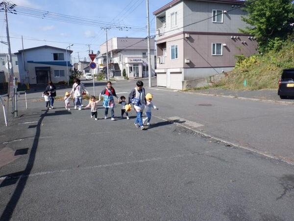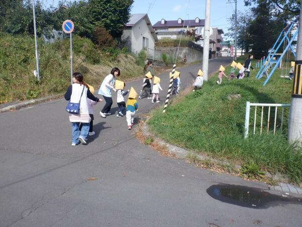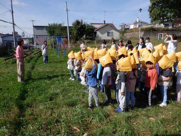 | 10月7日 火曜日 今日は、避難訓練が行われました。 震度3の地震発生、お部屋で避難しながら 防災頭巾を被ります。 火災も発生、お部屋にいるのは危険なため ピアソン公園へ走って避難です。 みんな頑張って、走ったので 無事公園に避難できました。 |