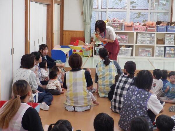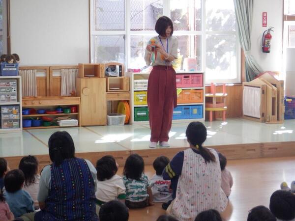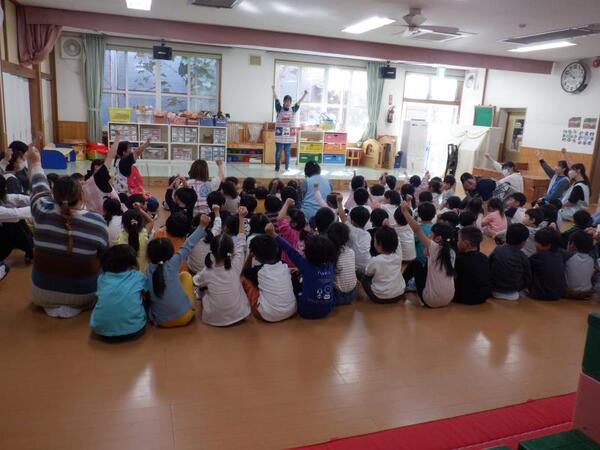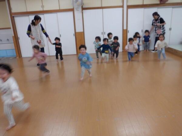 | 10月8日 水曜日 今日のマラソンごっこは、天候不良のため 明日に延期になりました。 残念でしたが、みんなお遊戯室に集まって 明日はがんばるぞー!と、 さらなる気合が入りましたよ。 |