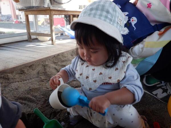 | 10月8日 水曜日 ももさんは、お砂場ランドで砂遊びです。 サラサラした砂を触ってみたり、スコップや バケツも使ってみましたよ。 わーい!砂遊び、楽しくなってきちゃったね♪ たくさん、遊べたね‼ |