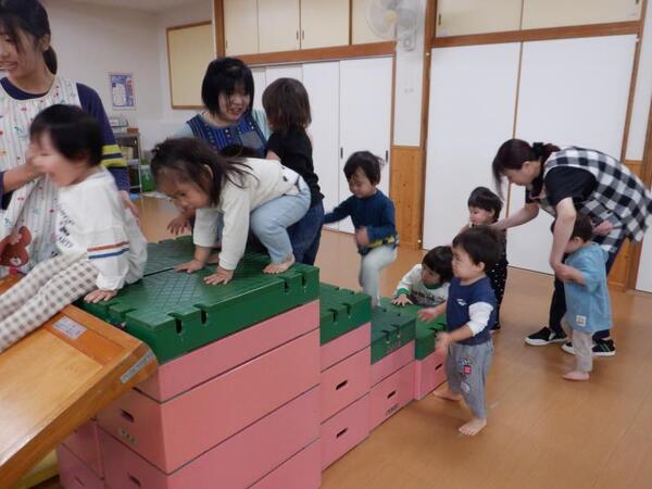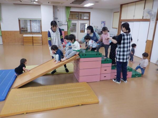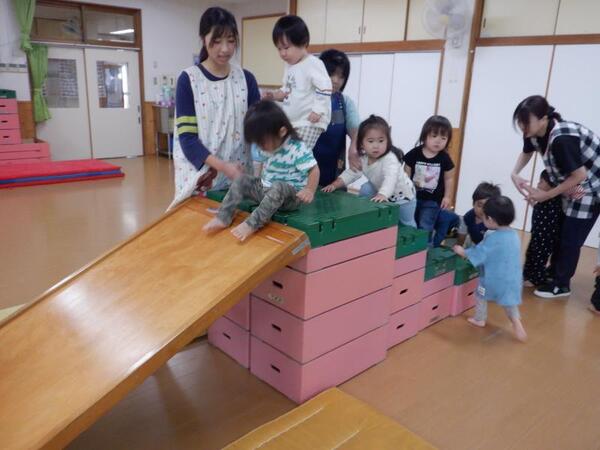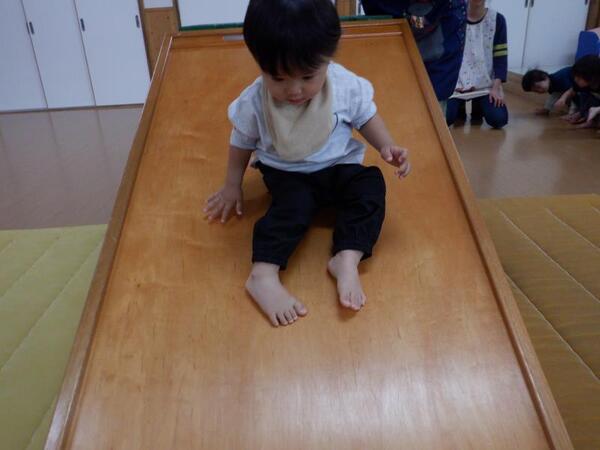 | 10月6日 月曜日 ちゅうりっぷさんは、お遊戯室で たくさん体を動かしましたよ。 よーいドンで、走ったり、 階段上って、板滑りしゅーーっ! みんな、笑顔で楽しそう。 スポーツの秋ですね。 |