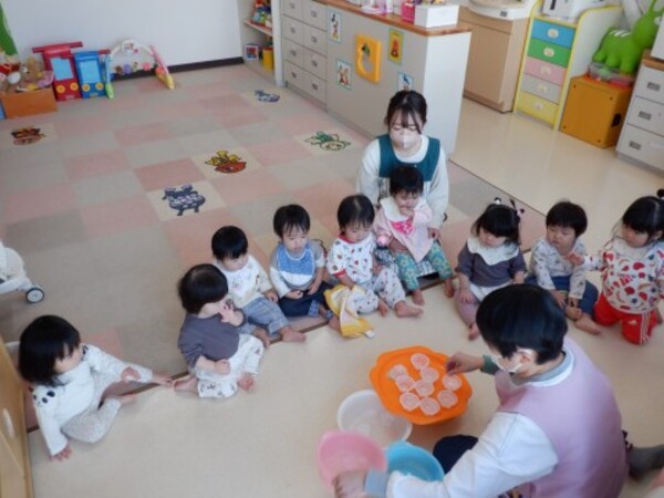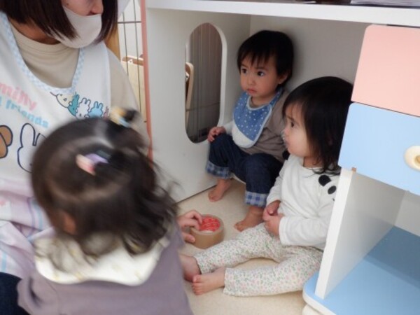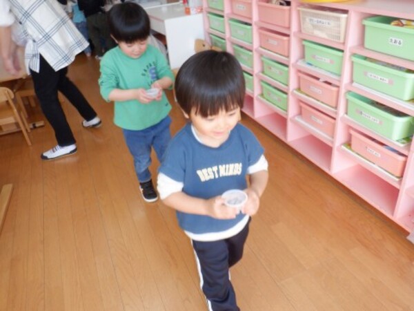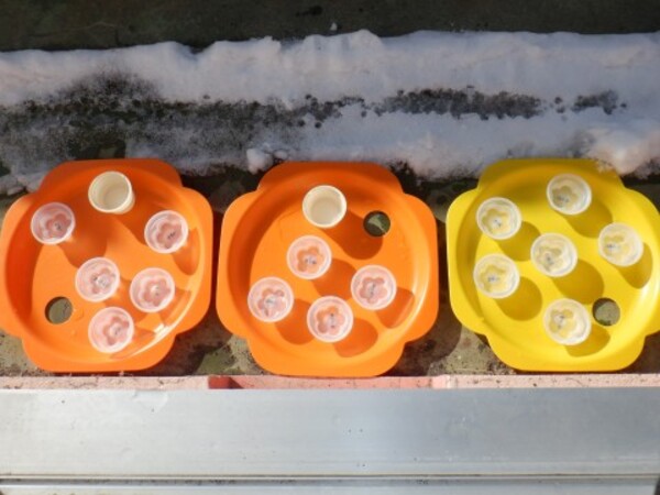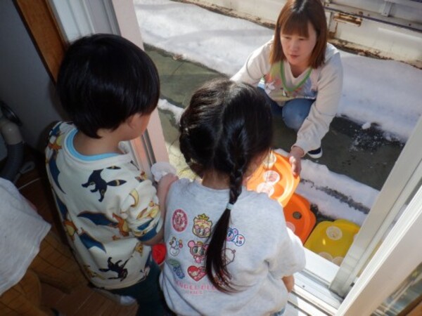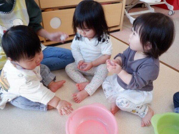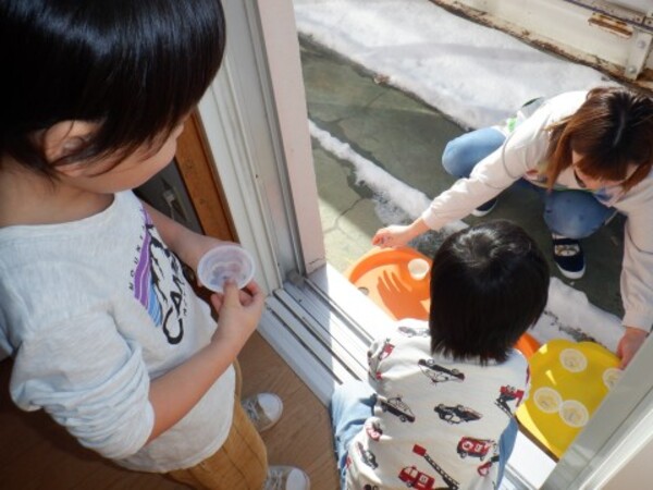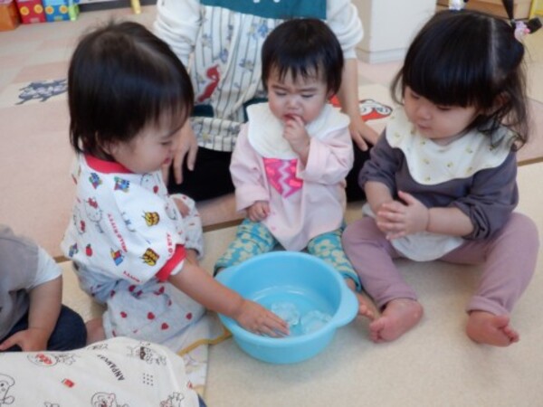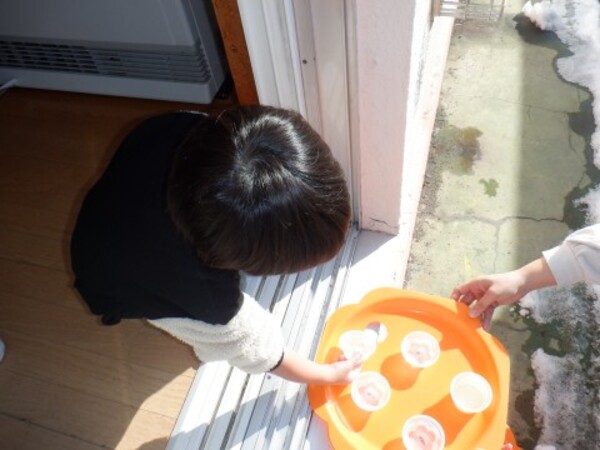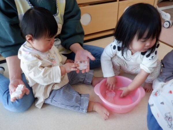 | 2月5日 木曜日 昨日 お水を入れてベランダに 出していたぜりーの容器 今日覗いてみたら なんと!なんと! 氷になっていたよ〜 早速 お部屋で氷を触ってみたよ お手々でじっくり触ってみた きゃあ〜!!冷たい!でも 面白い たくさん たくさん 触って楽しんだよ その後は お部屋の中でかくれんぼ 楽しかったね♪ |
