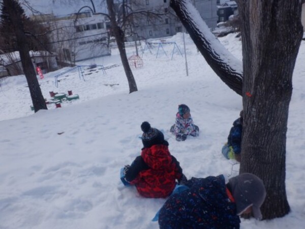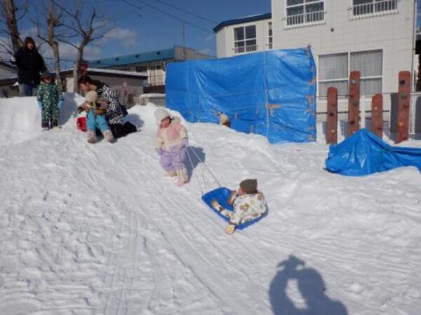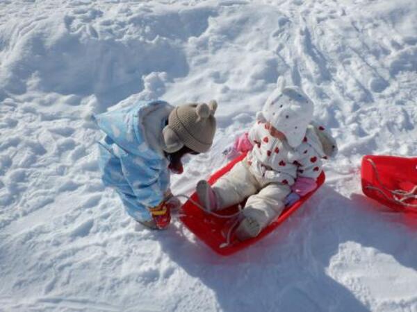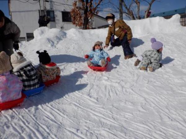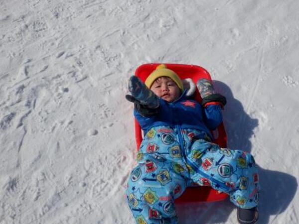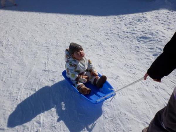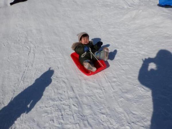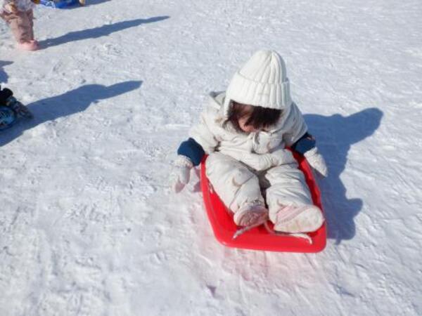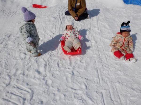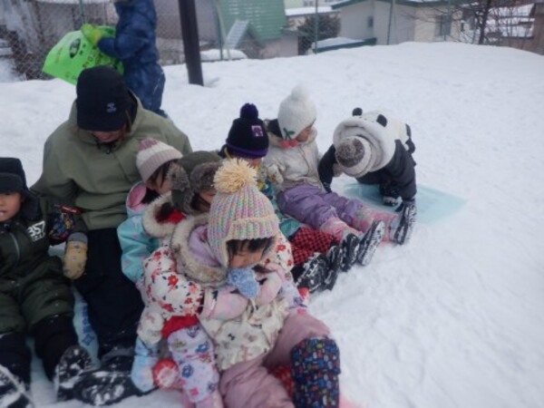 | 2月4日 水曜日 ももさんも、園庭に出ました。 本当に暖かくて、ぽかぽか陽気の中 存分にソリあそびをしましたよ。 しゅーーっ!ってすべって おもしろーい!またお外であそぼうね。 |