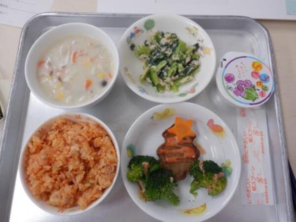 | 12月25日 木曜日 今日は、クリスマスメニューだよ! ケチャップライス、クリスマスツリーハンバーグ シチュー、ツナマヨ和え。 デザートは、ブドウゼリー。 ゆりさん、すみれさん、さくらさんは、 お遊戯室で、会食です。 みんなで、プレゼントは何が入っているのかな。 楽しくお話ししながら食べましたよ〜♪ |