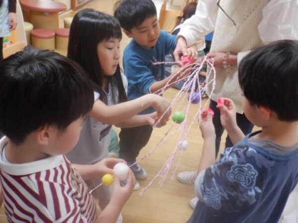 | 12月26日 金曜日 ゆりさんはお正月の縁起物 「まゆ玉作り」をしました。 まゆをお水につけて 木の枝にペタン 縁起物の鯛や小判、たわらも 付けて出来上がり!! 玄関に飾ったよ お正月のお迎えの準備OK |
