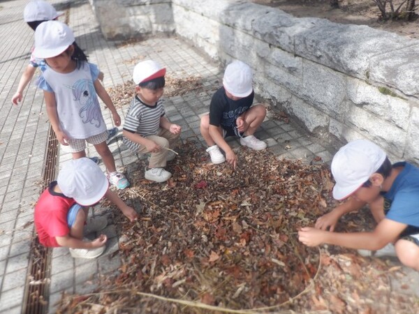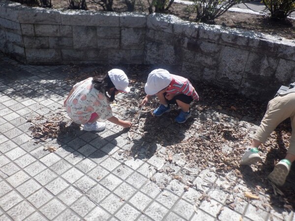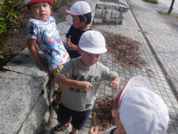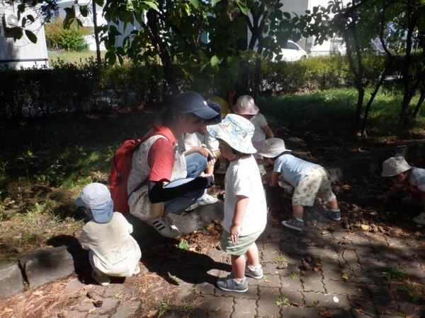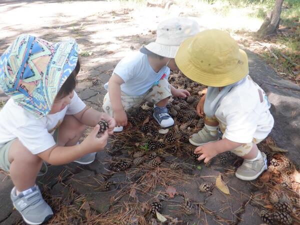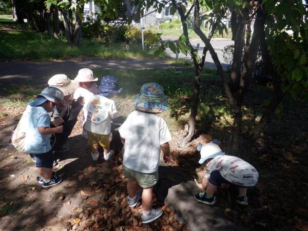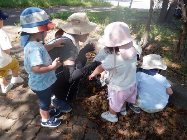 | 9月16日 火曜日 避難訓練の後、ちゅうりっぷさんは、 遊歩道に残って、秋の探索です。 松ぼっくりが、たくさん落ちていて みんな、興味津々。触ってみたり、集めてみたりを 楽しんでいましたよ。 秋だけど、ちょっとだけ暑かったね。 |