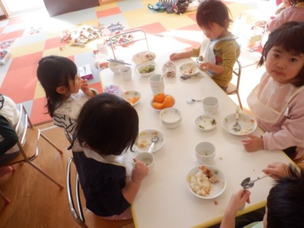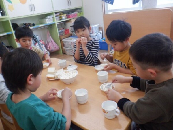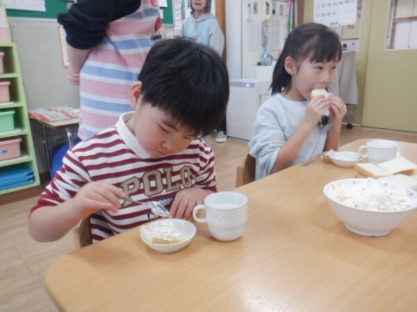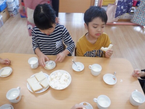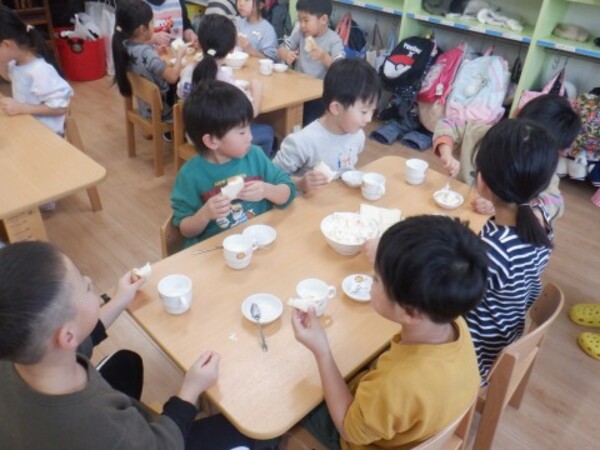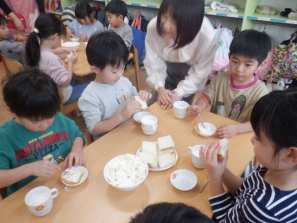 | 12月19日 金曜日 今日はゆりさん 手作りおやつの日!! みんなでフルーツサンドを作るよ やったー! どうやって作るの? 給食先生に教えてもらいながら たっぷり ホイップクリームを パンにはさんで・・・出来たら・・ 大きなお口でパクパク パクパク たくさん おかわりもしたよ〜 みんなで作って 食べて 美味しかったね また 手作りおやつしようね |
