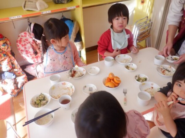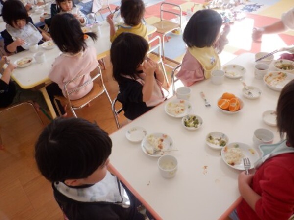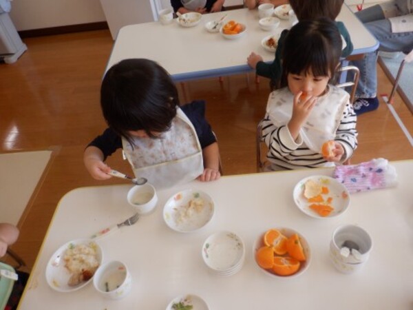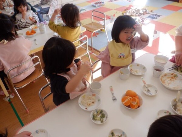 | 12月19日 金曜日 今日のメニューはお誕生会メニュー エスカロップ、ブロッコリーツナ和え 豆乳スープ、果物はみかん パクパク モリモリ お腹いっぱい食べたよ〜 いっぱい 食べて 大きくなろうね |